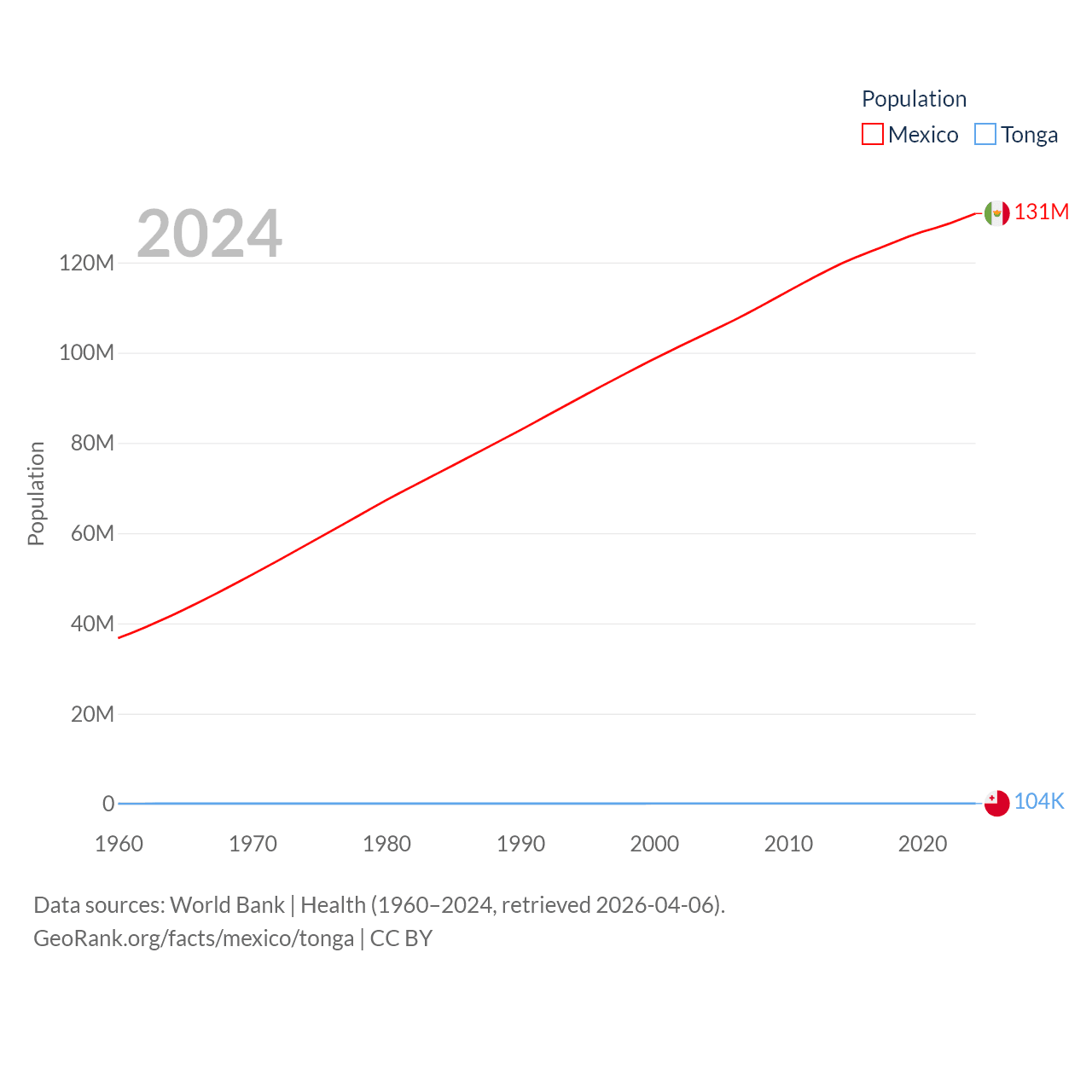 Mexico has a population of 131M (ranked 11/197), compared with 104K in Tonga (ranked 183/197). Mexico's land area is 750,563 sq mi versus 278 sq mi for Tonga (ranked 13th vs. 176th).