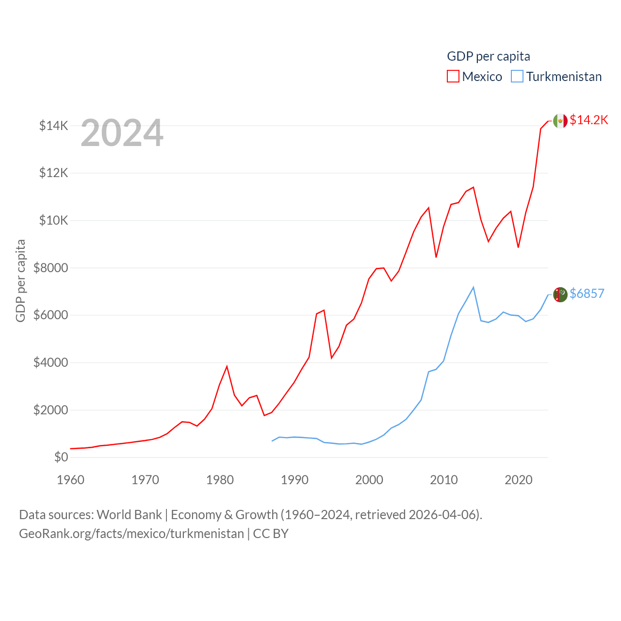 By GDP, Mexico ranks 13/197 ($1.86T) and Turkmenistan ranks 92/197 ($51.4B). By GDP per capita, Mexico ranks 69/197 ($14,186), while Turkmenistan ranks 104/197 ($6,857).