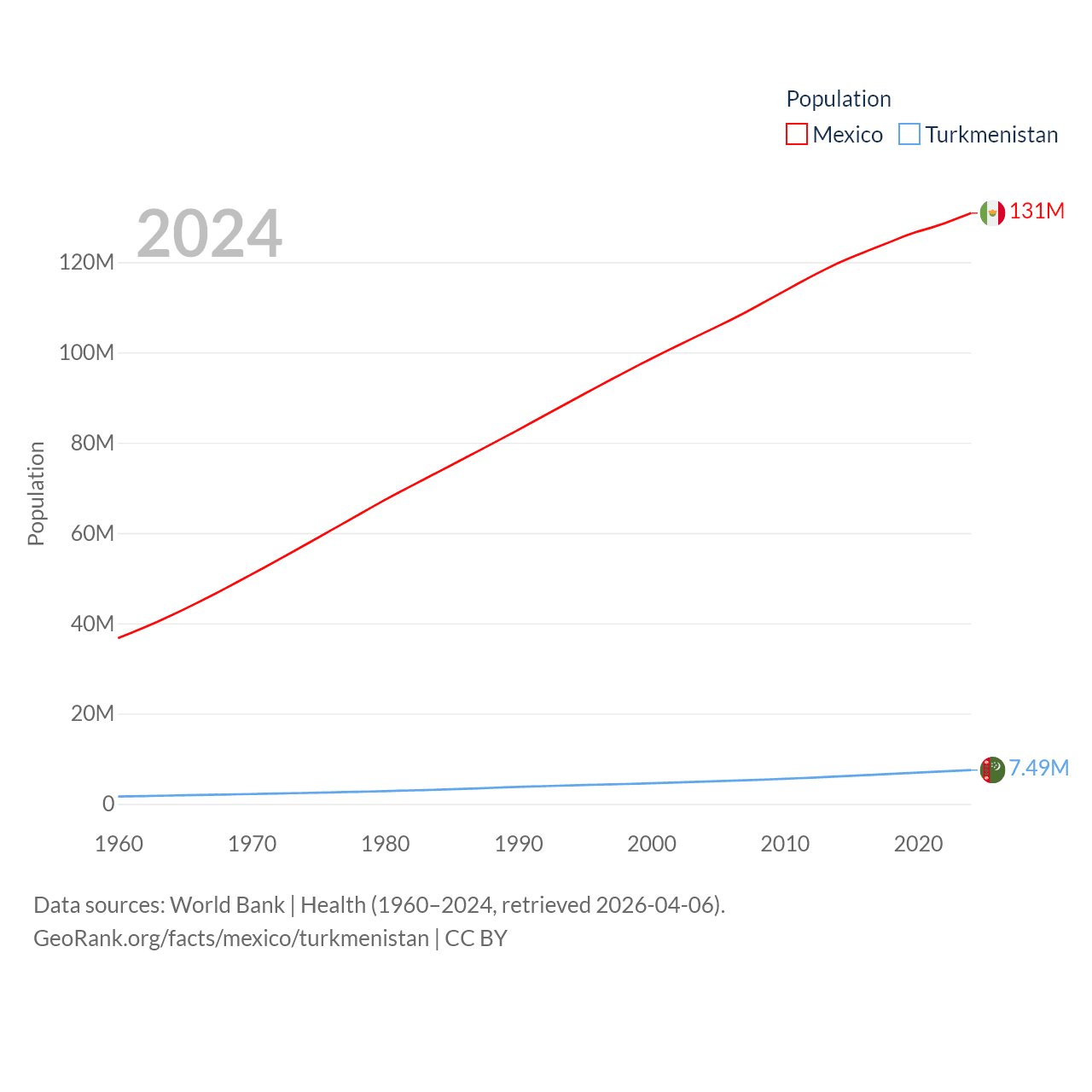 Mexico has a population of 131M (ranked 11/197), compared with 7.49M in Turkmenistan (ranked 104/197). Mexico's land area is 750,563 sq mi versus 181,441 sq mi for Turkmenistan (ranked 13th vs. 53rd).