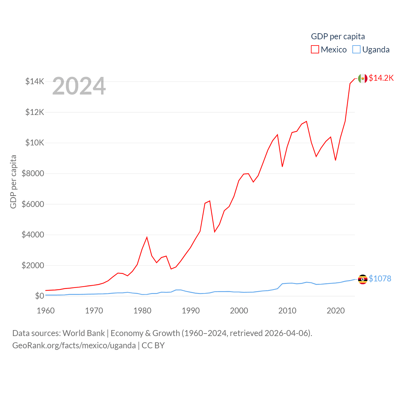 By GDP, Mexico ranks 13/197 ($1.86T) and Uganda ranks 89/197 ($53.9B). By GDP per capita, Mexico ranks 69/197 ($14,186), while Uganda ranks 176/197 ($1,078).