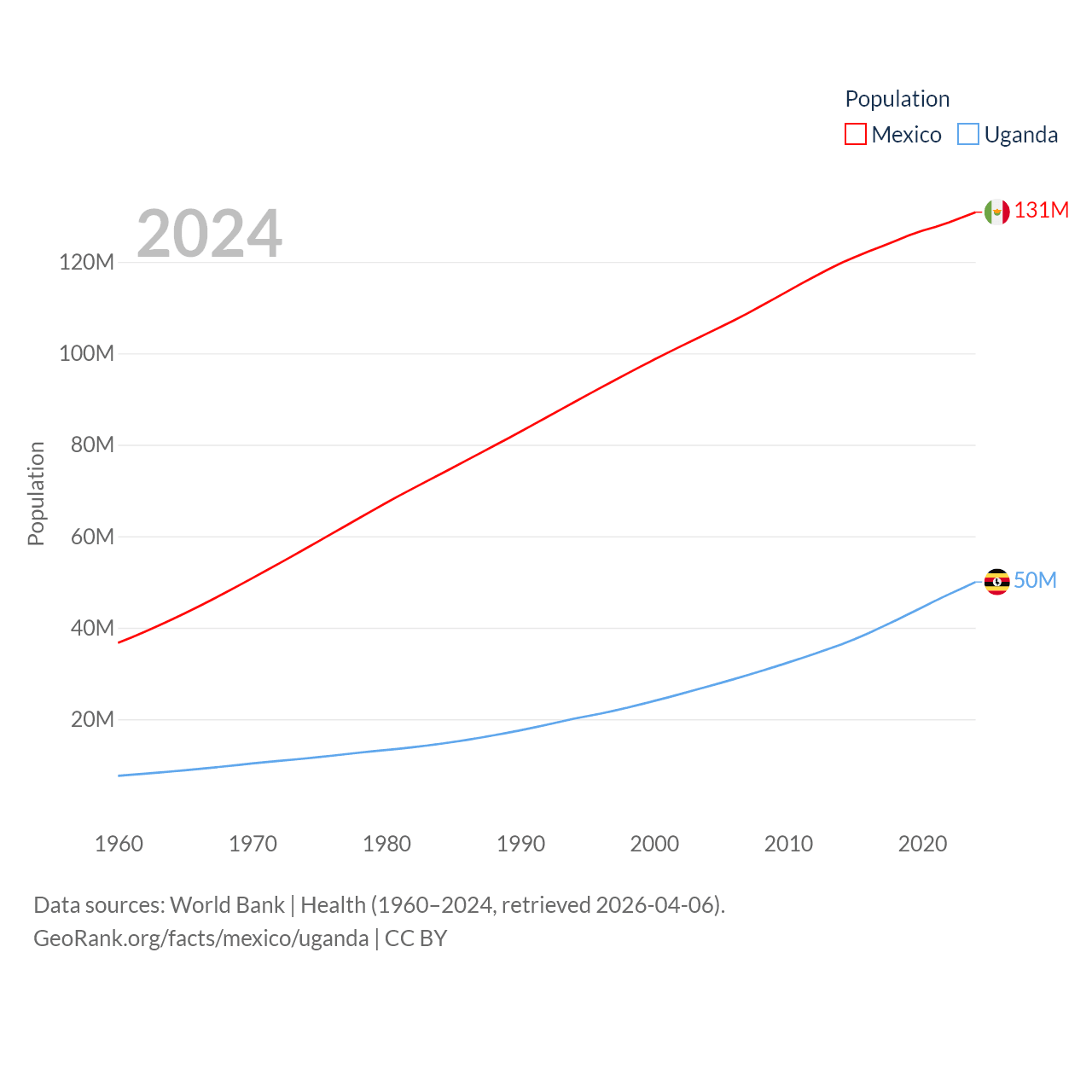 Mexico has a population of 131M (ranked 11/197), compared with 50M in Uganda (ranked 31/197). Mexico's land area is 750,563 sq mi versus 77,421 sq mi for Uganda (ranked 13th vs. 84th).