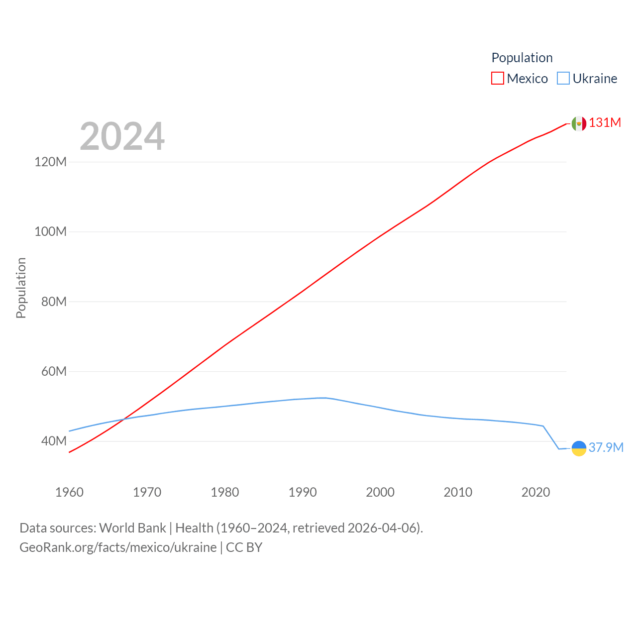 Mexico has a population of 131M (ranked 11/197), compared with 37.9M in Ukraine (ranked 41/197). Mexico's land area is 750,563 sq mi versus 223,708 sq mi for Ukraine (ranked 13th vs. 46th).