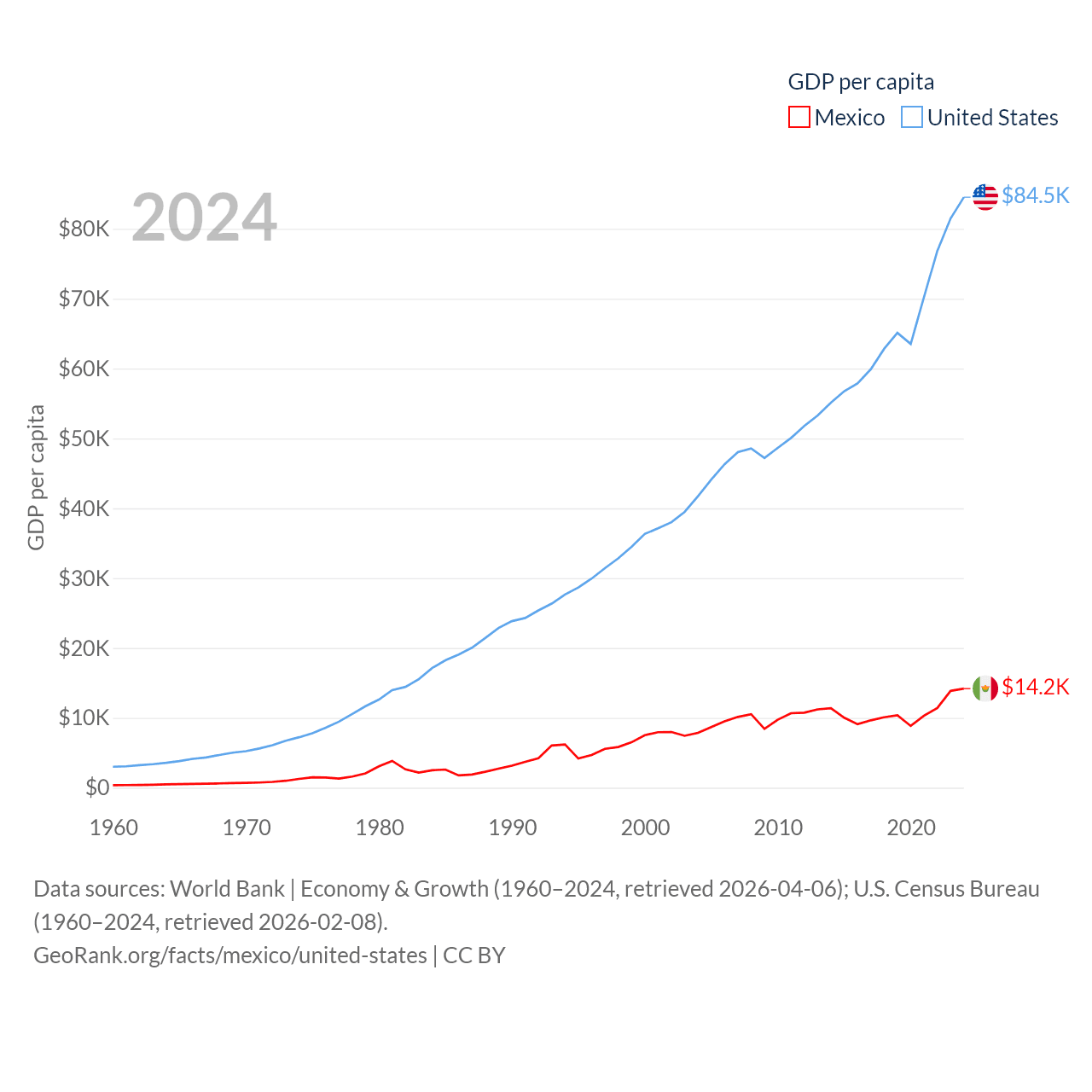 By GDP, Mexico ranks 13/197 ($1.86T) and The United States ranks 1/197 ($28.8T). By GDP per capita, Mexico ranks 69/197 ($14,186), while The United States ranks 10/197 ($84,534).