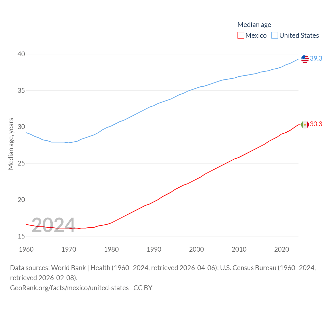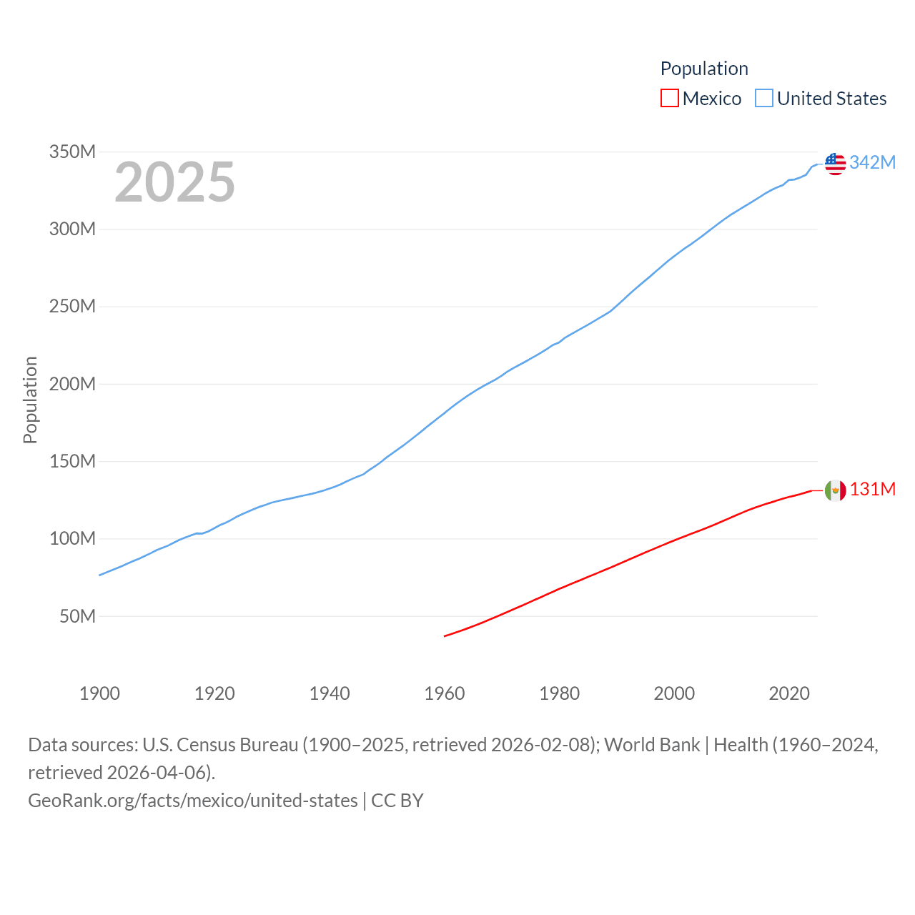 Mexico has a population of 131M (ranked 11/197), compared with 342M in The United States (ranked 3/197). Mexico's land area is 750,563 sq mi versus 3,531,839 sq mi for The United States (ranked 13th vs. 3rd).