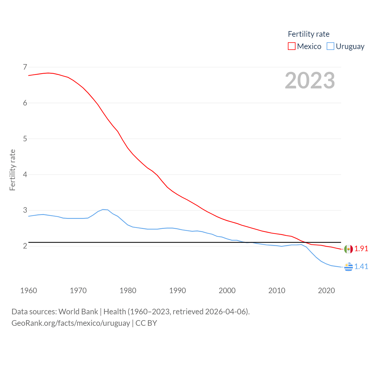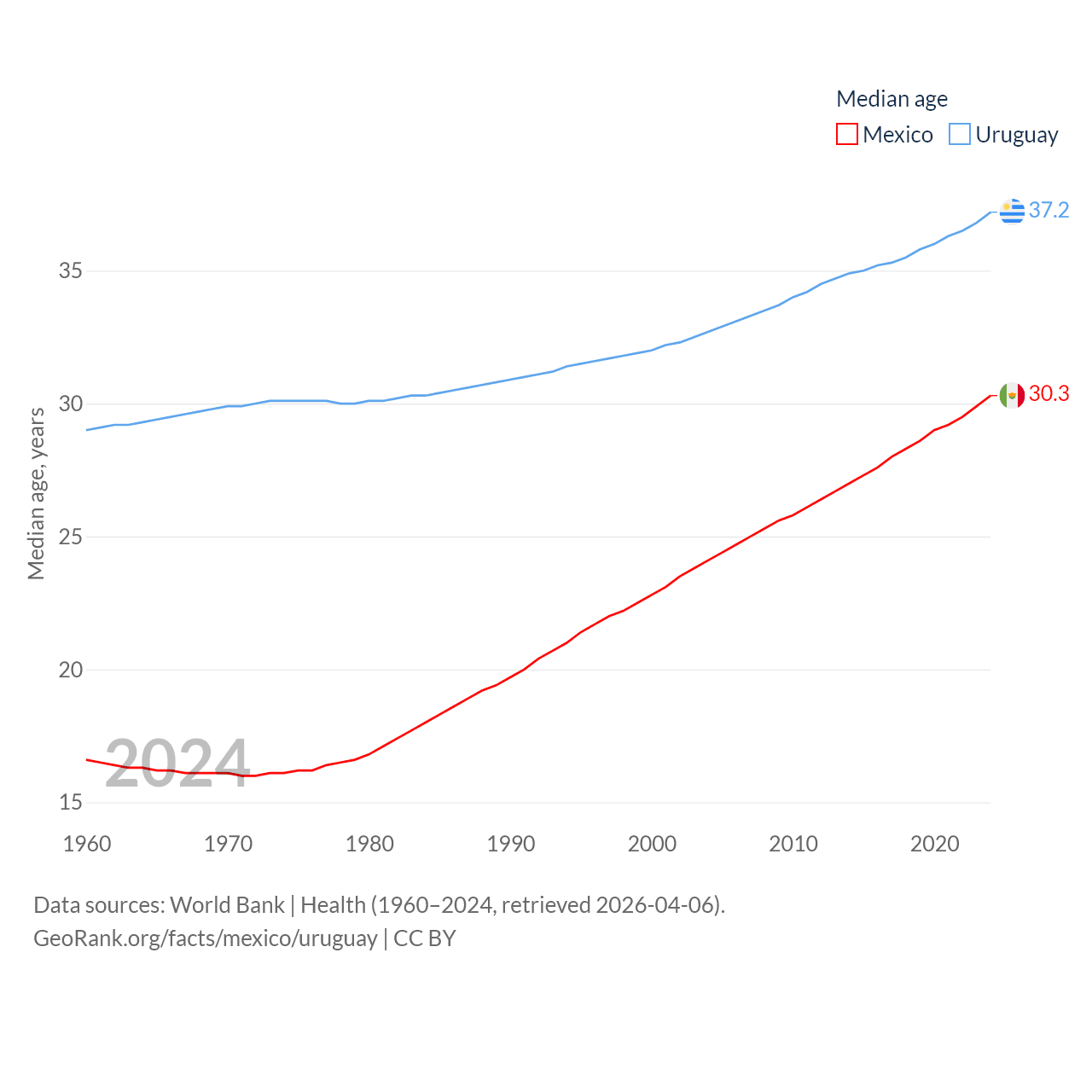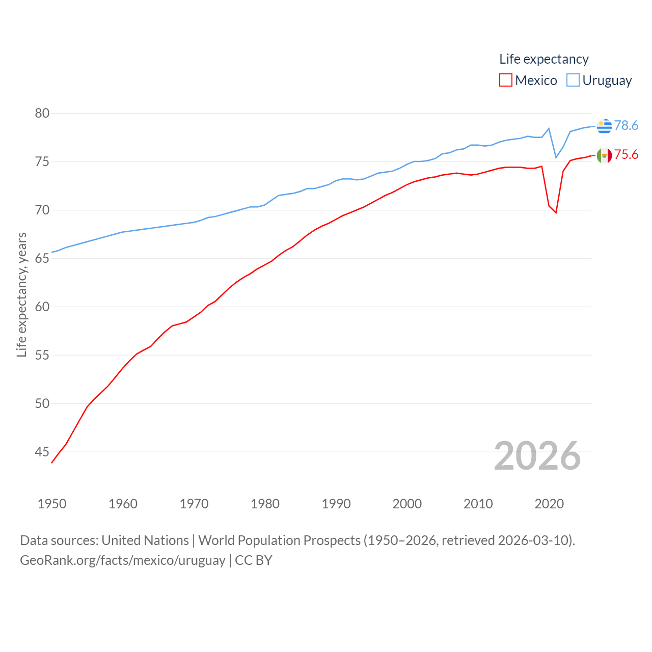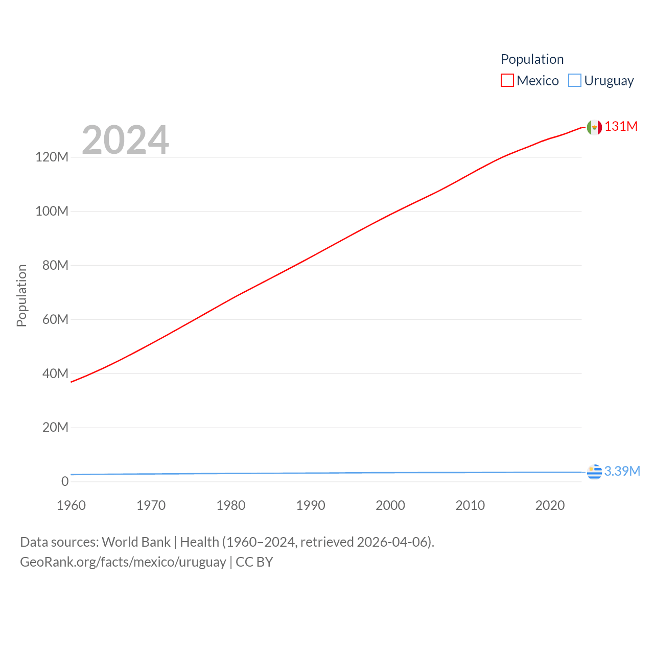 Mexico has a population of 131M (ranked 11/197), compared with 3.39M in Uruguay (ranked 133/197). Mexico's land area is 750,563 sq mi versus 67,576 sq mi for Uruguay (ranked 13th vs. 89th).