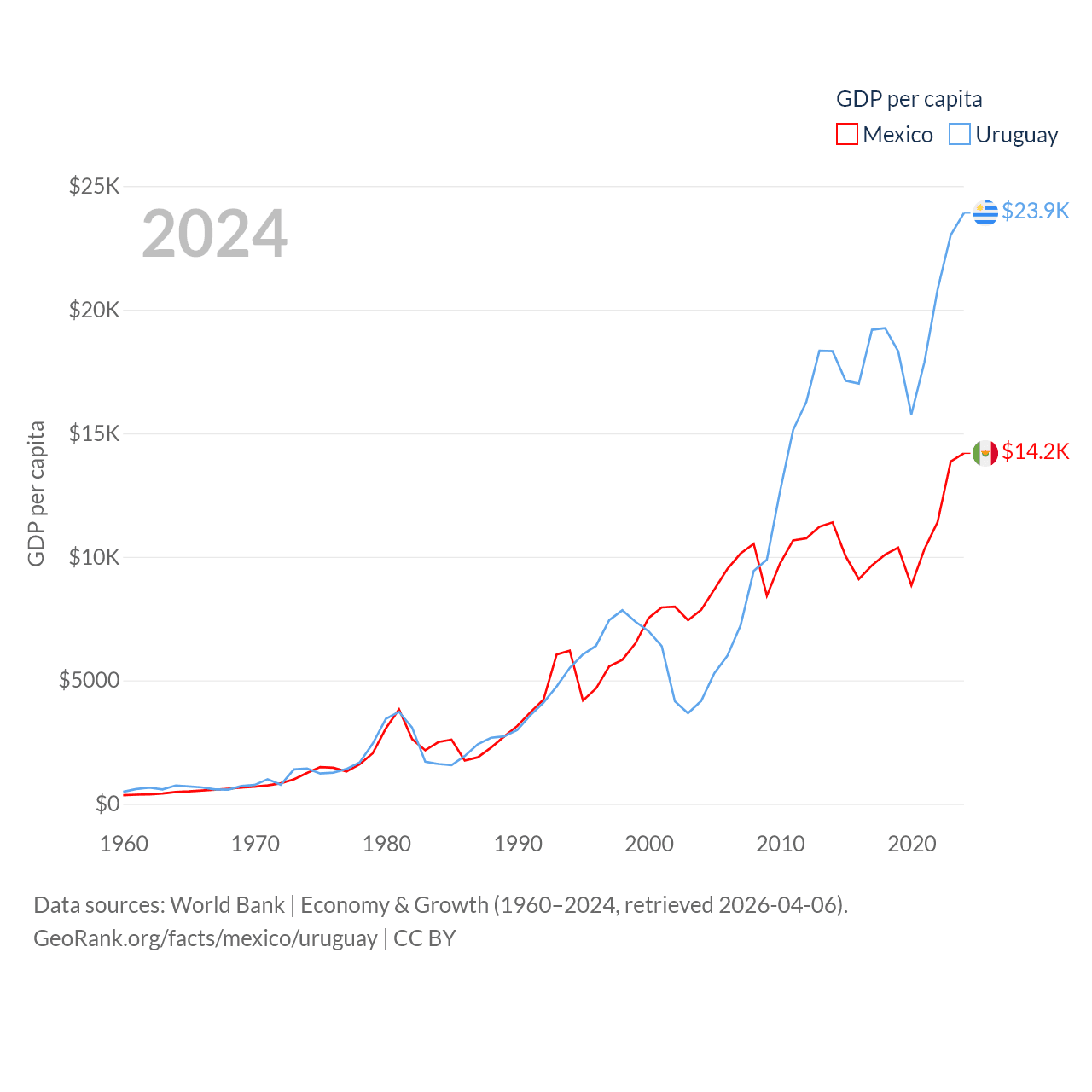 By GDP, Mexico ranks 13/197 ($1.86T) and Uruguay ranks 81/197 ($81B). By GDP per capita, Mexico ranks 69/197 ($14,186), while Uruguay ranks 52/197 ($23,907).