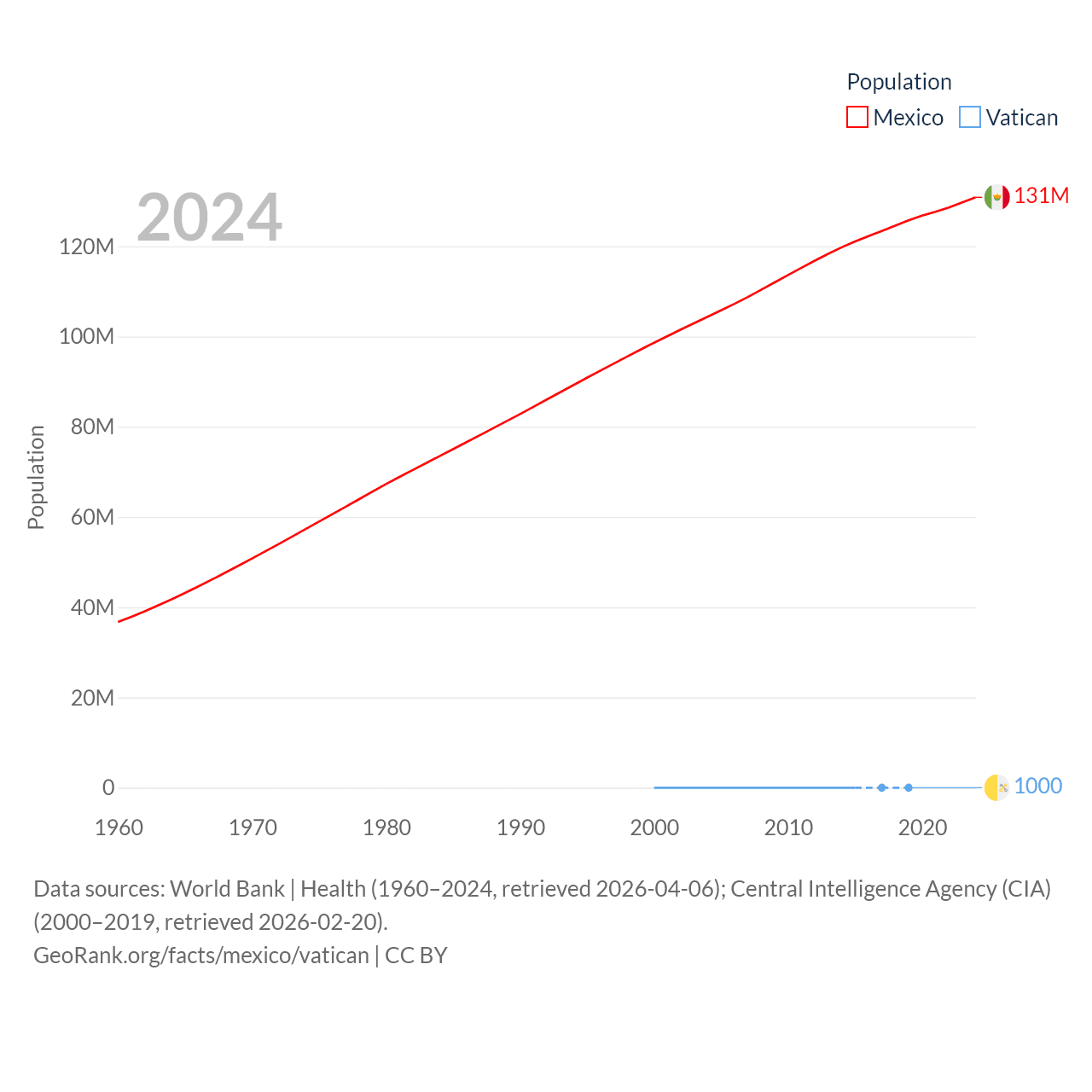 Mexico has a population of 131M (ranked 11/197), compared with 1K in The Vatican (ranked 197/197). Mexico's land area is 750,563 sq mi versus 0.17 sq mi for The Vatican (ranked 13th vs. 197th).