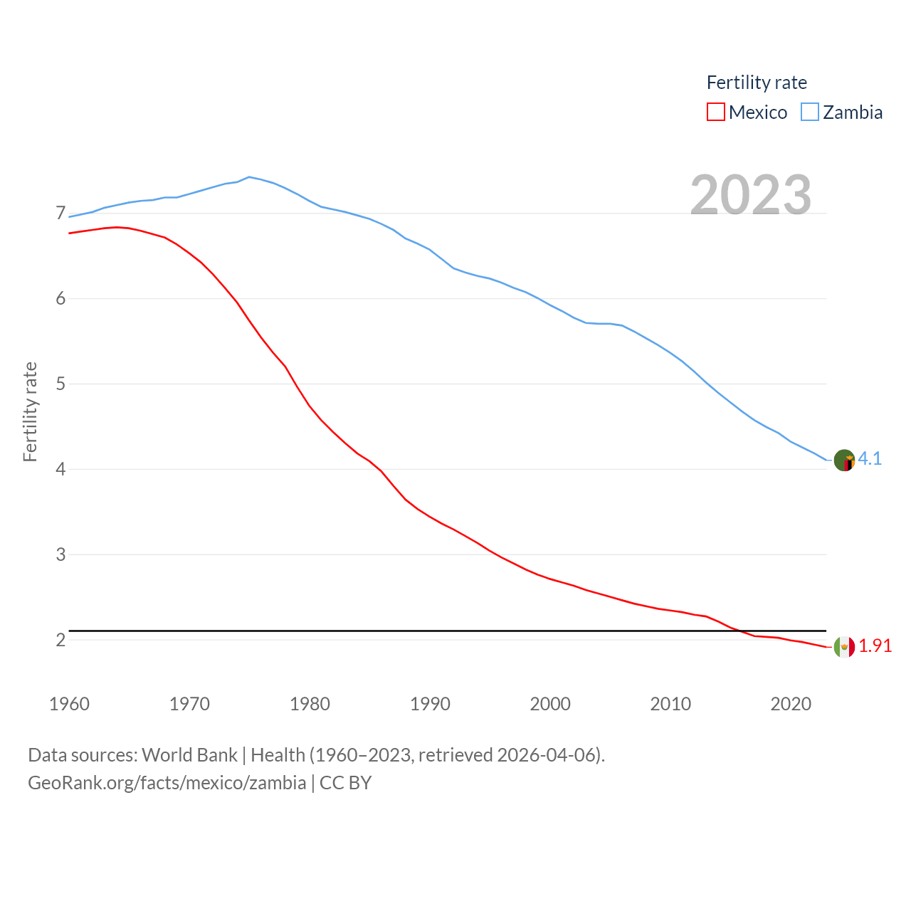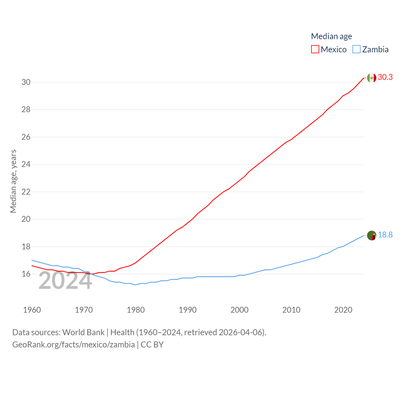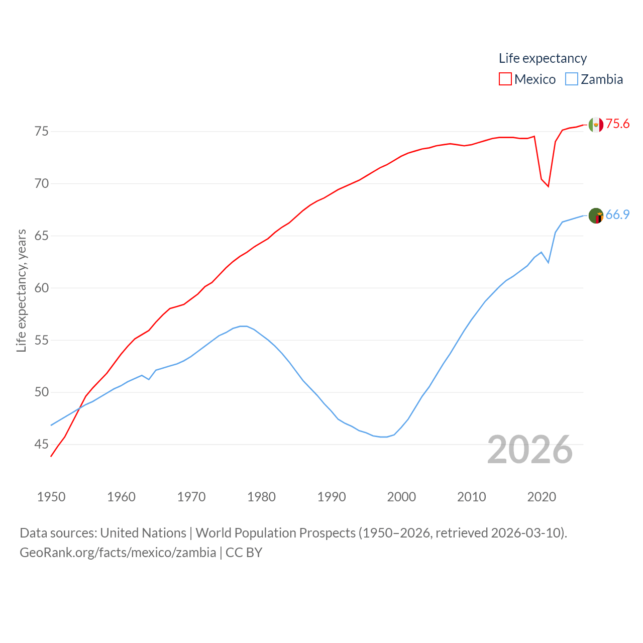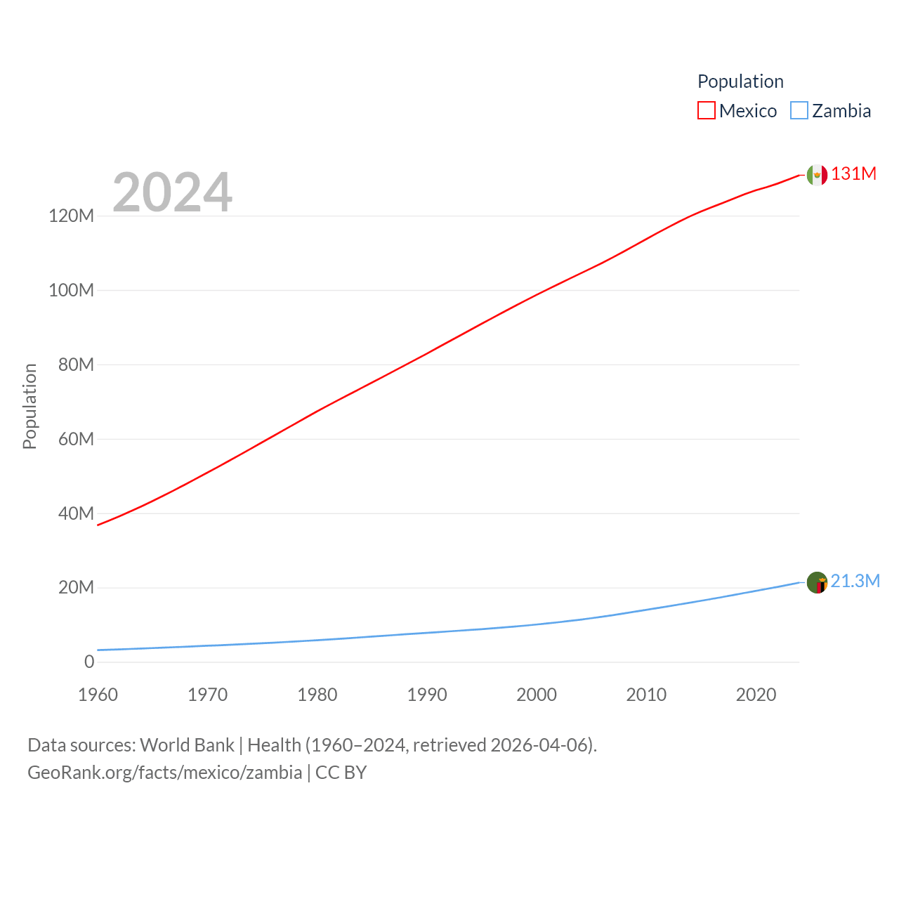 Mexico has a population of 131M (ranked 11/197), compared with 21.3M in Zambia (ranked 63/197). Mexico's land area is 750,563 sq mi versus 287,024 sq mi for Zambia (ranked 13th vs. 37th).