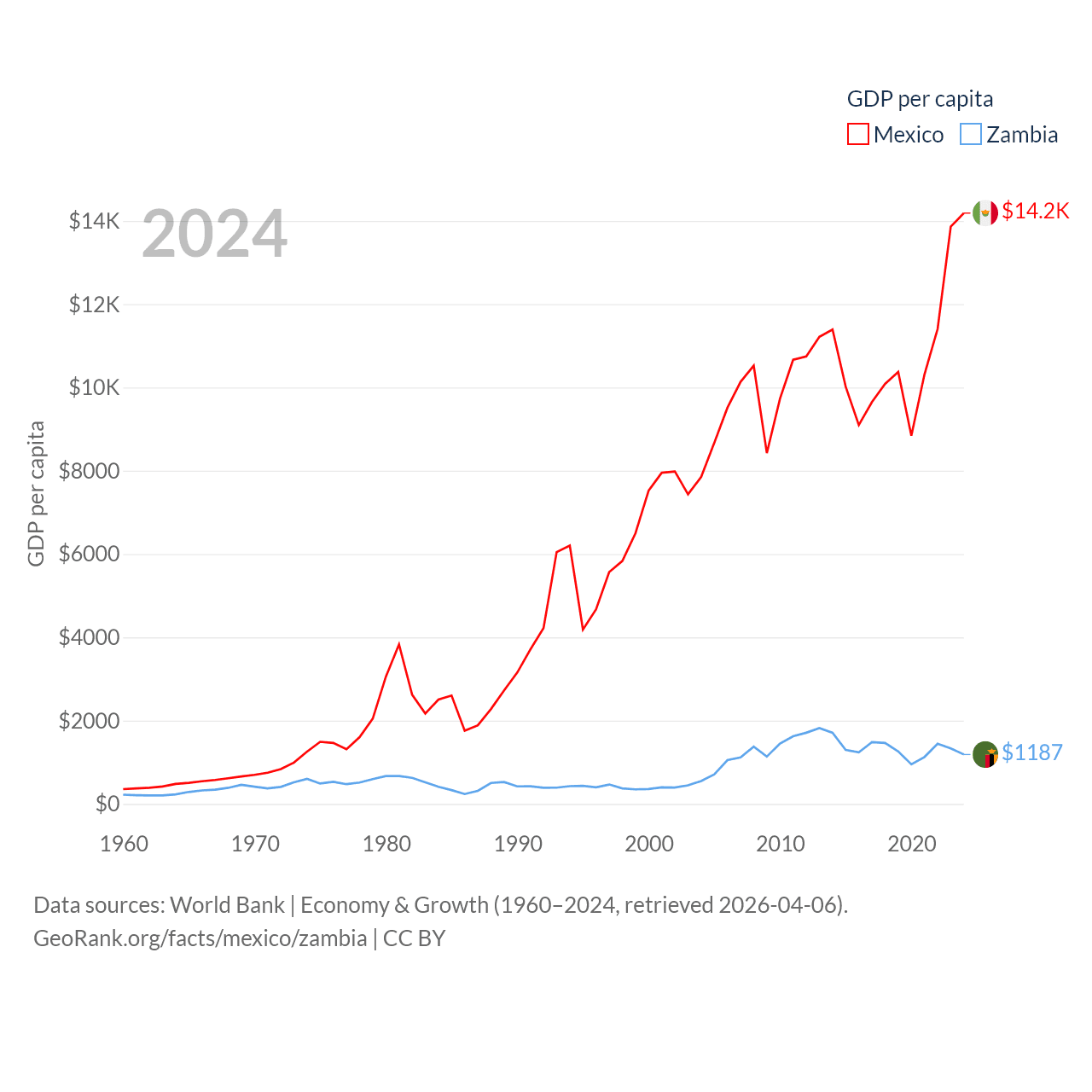 By GDP, Mexico ranks 13/197 ($1.86T) and Zambia ranks 116/197 ($25.3B). By GDP per capita, Mexico ranks 69/197 ($14,186), while Zambia ranks 169/197 ($1,187).