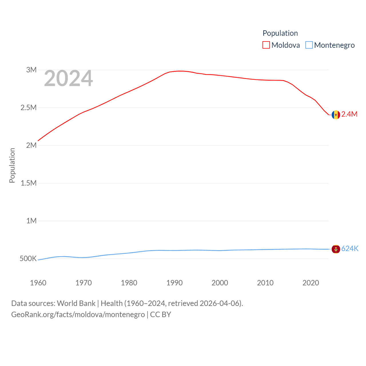 Moldova has a population of 2.4M (ranked 143/197), compared with 624K in Montenegro (ranked 166/197). Moldova's land area is 12,714 sq mi versus 5,193 sq mi for Montenegro (ranked 135th vs. 156th).