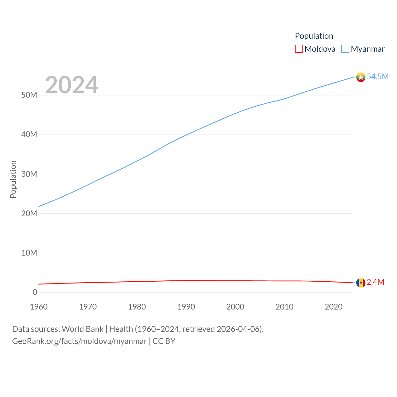 Moldova has a population of 2.4M (ranked 143/197), compared with 54.5M in Myanmar (ranked 27/197). Moldova's land area is 12,714 sq mi versus 251,997 sq mi for Myanmar (ranked 135th vs. 39th).