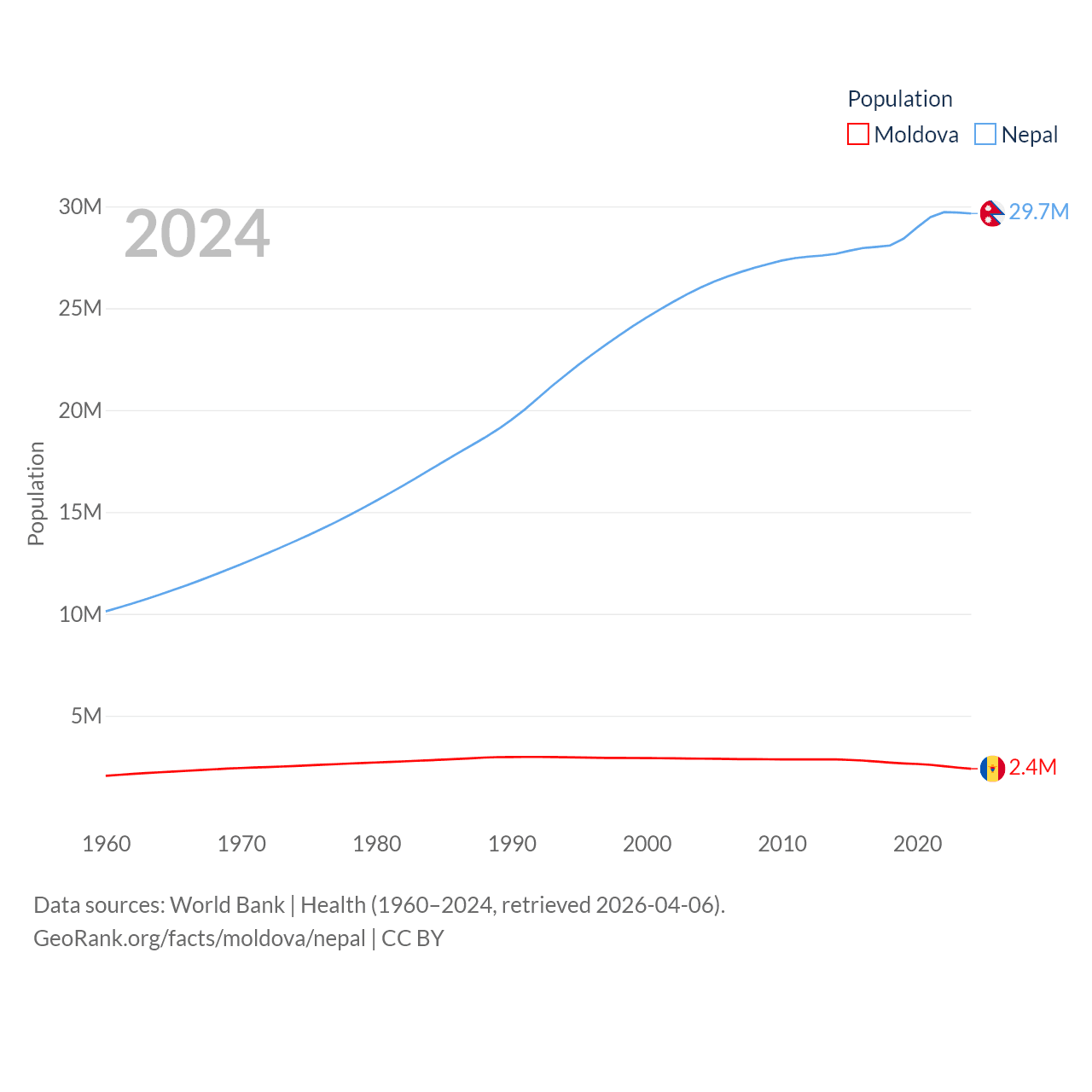 Moldova has a population of 2.4M (ranked 143/197), compared with 29.7M in Nepal (ranked 51/197). Moldova's land area is 12,714 sq mi versus 55,348 sq mi for Nepal (ranked 135th vs. 92nd).