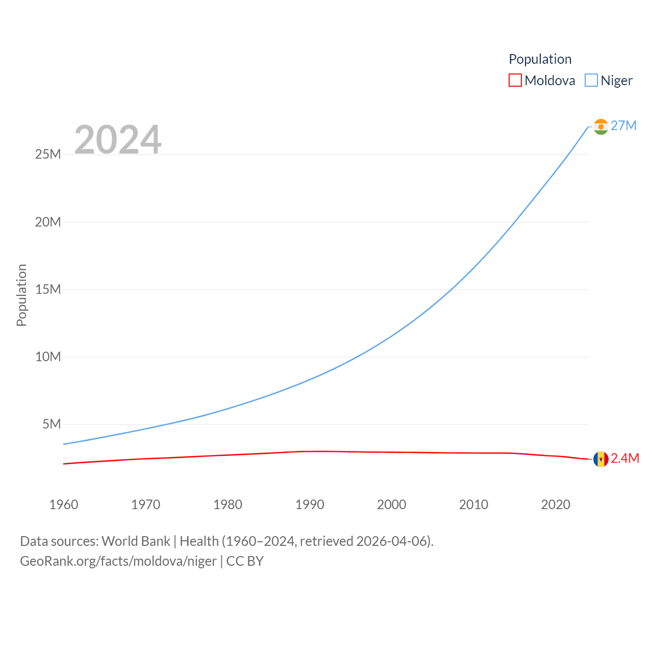 Moldova has a population of 2.4M (ranked 143/197), compared with 27M in Niger (ranked 55/197). Moldova's land area is 12,714 sq mi versus 489,076 sq mi for Niger (ranked 135th vs. 20th).