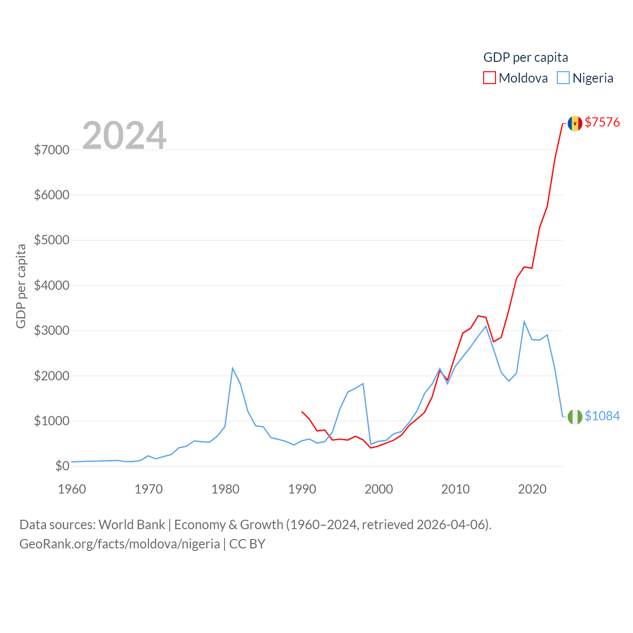 By GDP, Moldova ranks 134/197 ($18.2B) and Nigeria ranks 54/197 ($252B). By GDP per capita, Moldova ranks 99/197 ($7,576), while Nigeria ranks 174/197 ($1,084).