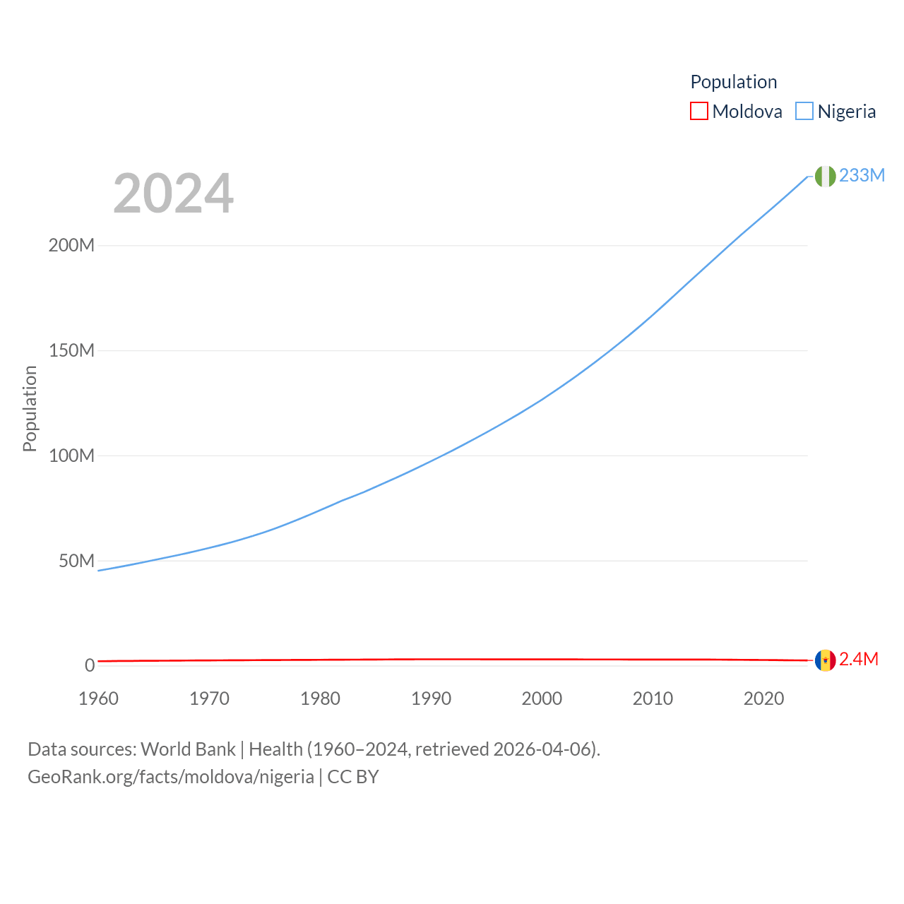 Moldova has a population of 2.4M (ranked 143/197), compared with 233M in Nigeria (ranked 6/197). Moldova's land area is 12,714 sq mi versus 351,650 sq mi for Nigeria (ranked 135th vs. 30th).