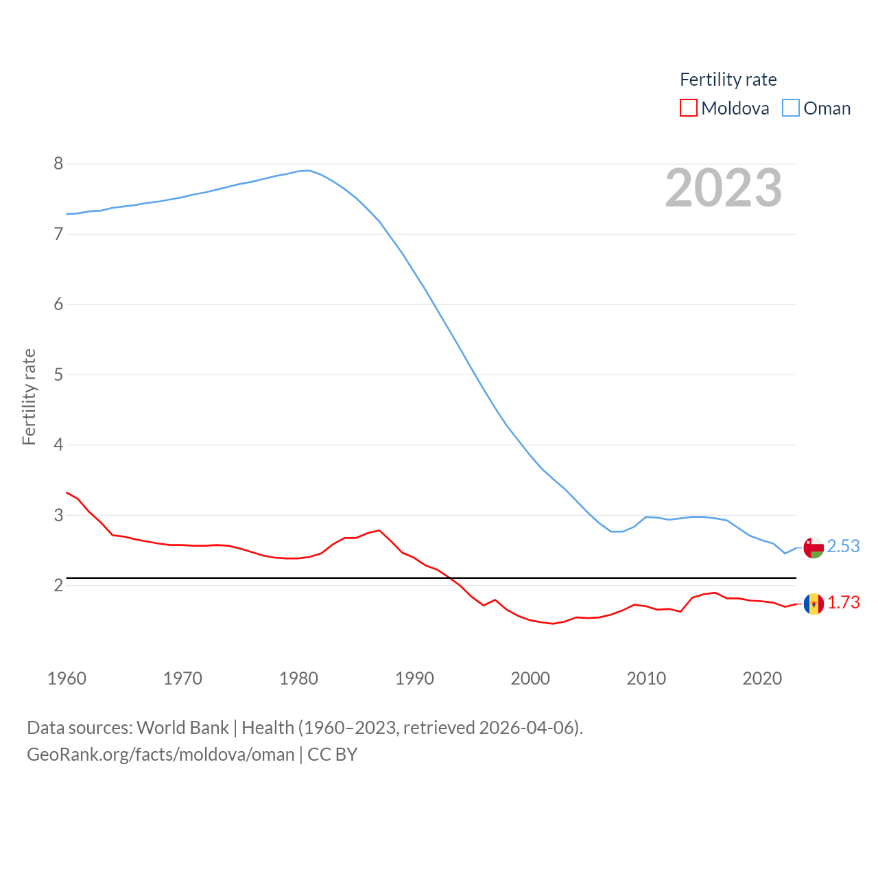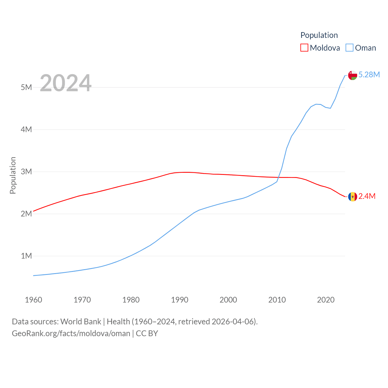 Moldova has a population of 2.4M (ranked 143/197), compared with 5.28M in Oman (ranked 124/197). Moldova's land area is 12,714 sq mi versus 119,499 sq mi for Oman (ranked 135th vs. 68th).