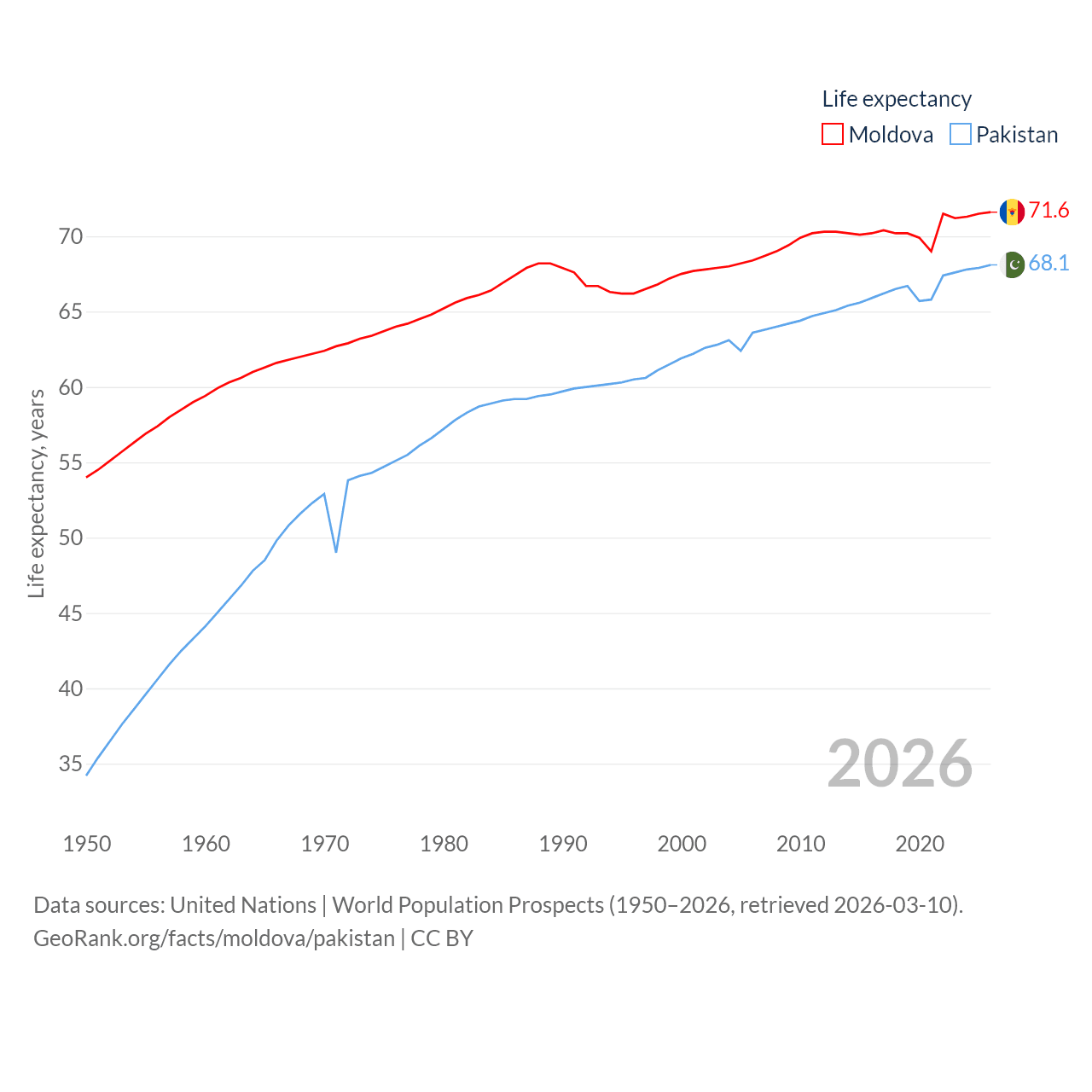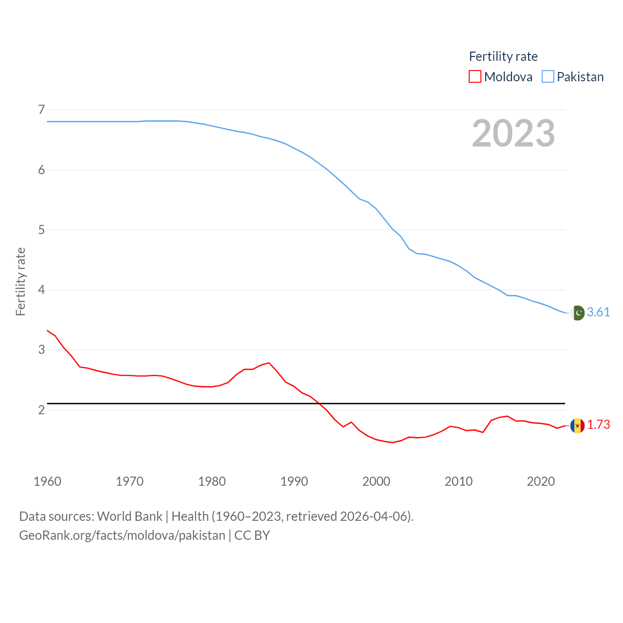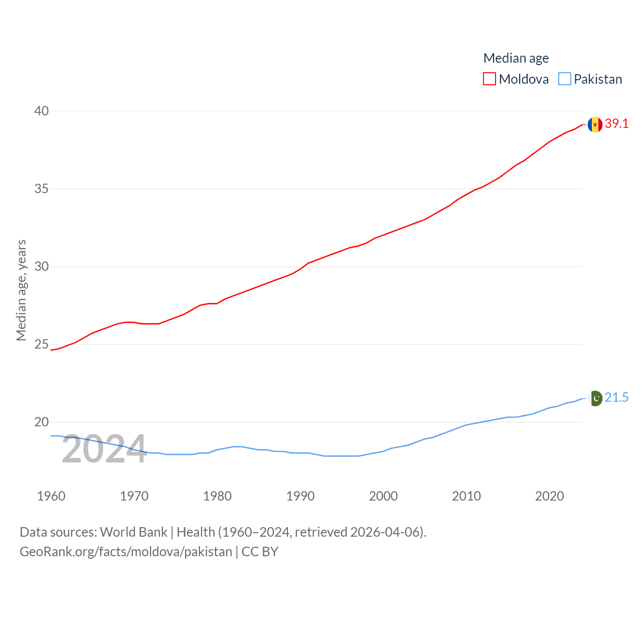 Moldova has a population of 2.4M (ranked 143/197), compared with 251M in Pakistan (ranked 5/197). Moldova's land area is 12,714 sq mi versus 297,638 sq mi for Pakistan (ranked 135th vs. 35th).