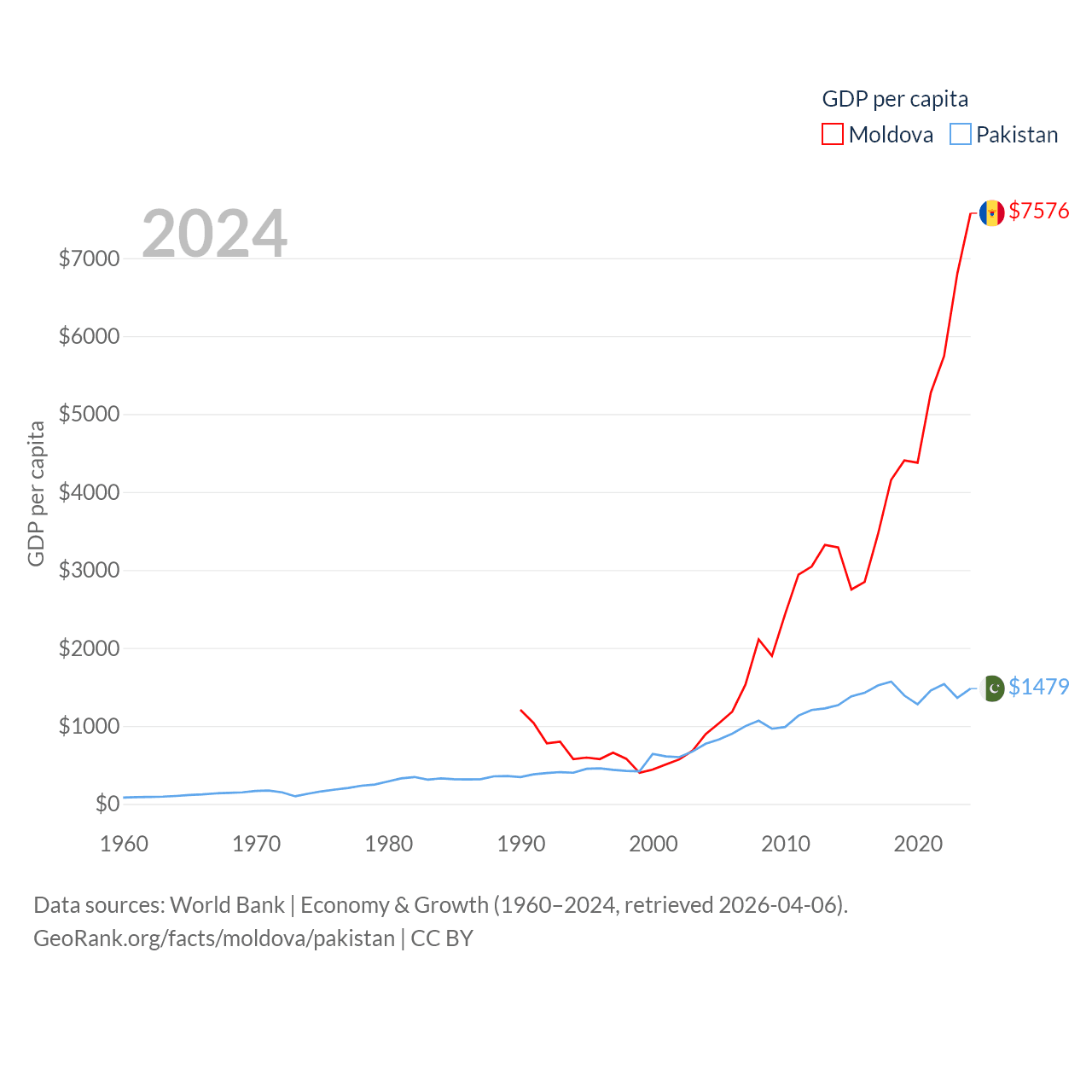 By GDP, Moldova ranks 134/197 ($18.2B) and Pakistan ranks 43/197 ($372B). By GDP per capita, Moldova ranks 99/197 ($7,576), while Pakistan ranks 163/197 ($1,479).