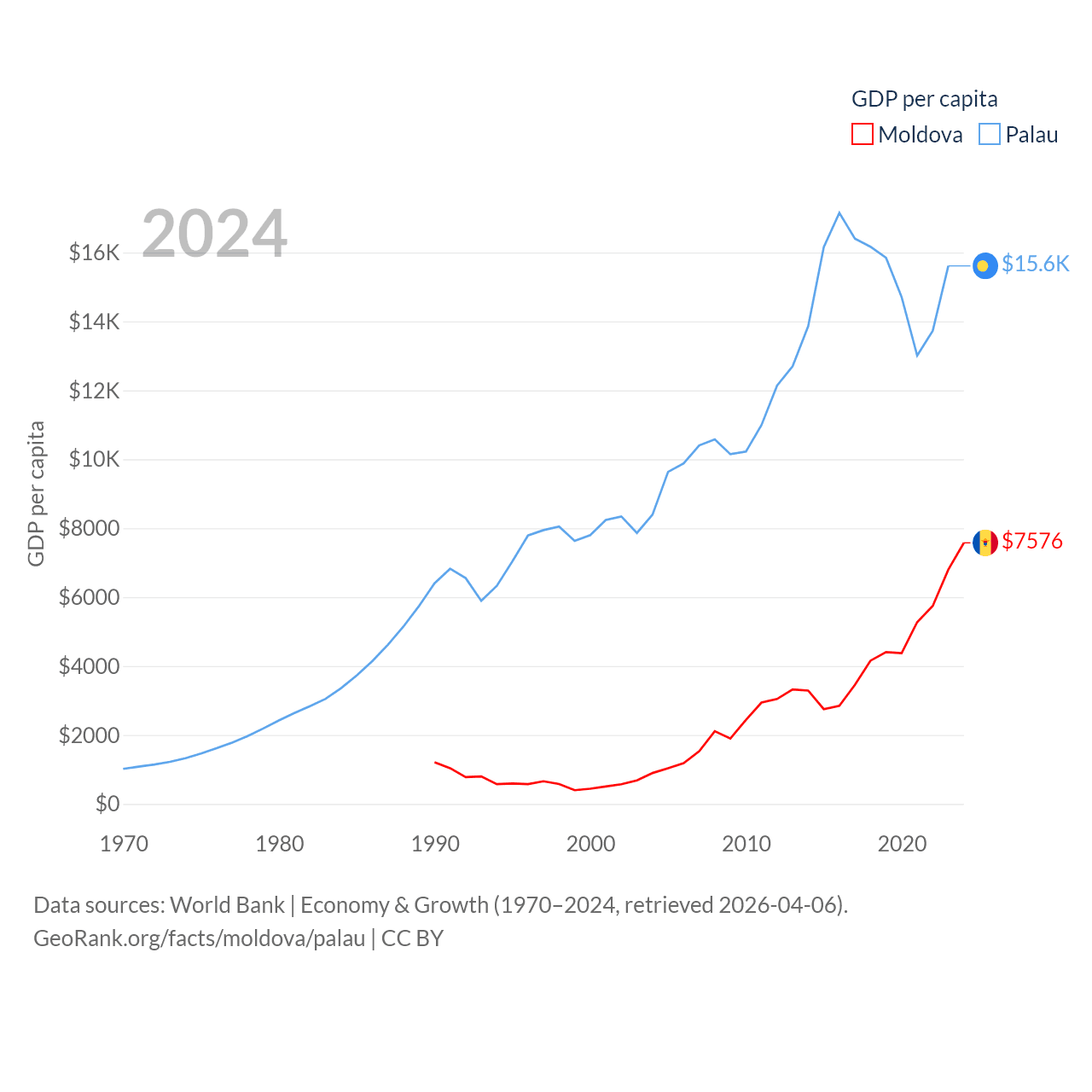 By GDP, Moldova ranks 134/197 ($18.2B) and Palau ranks 194/197 ($277M). By GDP per capita, Moldova ranks 99/197 ($7,576), while Palau ranks 67/197 ($15,611).