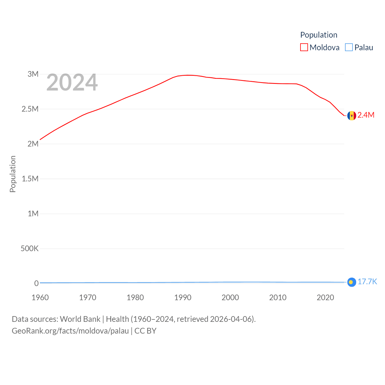 Moldova has a population of 2.4M (ranked 143/197), compared with 17.7K in Palau (ranked 194/197). Moldova's land area is 12,714 sq mi versus 177.6 sq mi for Palau (ranked 135th vs. 180th).