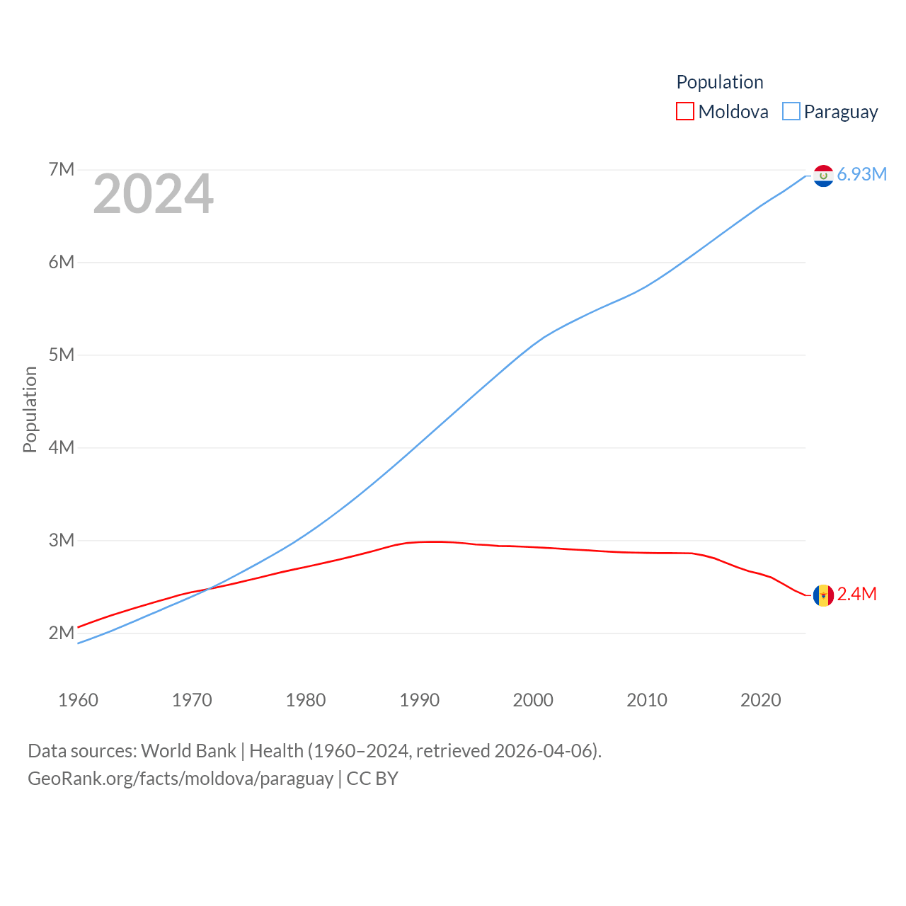 Moldova has a population of 2.4M (ranked 143/197), compared with 6.93M in Paraguay (ranked 107/197). Moldova's land area is 12,714 sq mi versus 152,901 sq mi for Paraguay (ranked 135th vs. 59th).