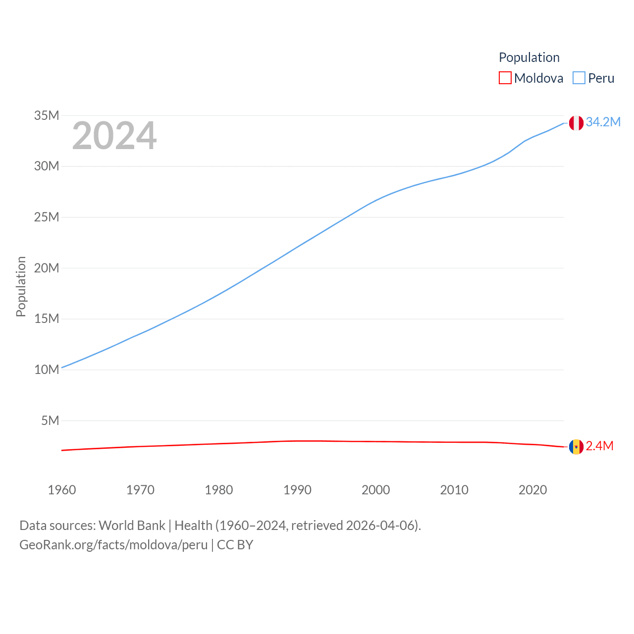 Moldova has a population of 2.4M (ranked 143/197), compared with 34.2M in Peru (ranked 48/197). Moldova's land area is 12,714 sq mi versus 494,211 sq mi for Peru (ranked 135th vs. 19th).