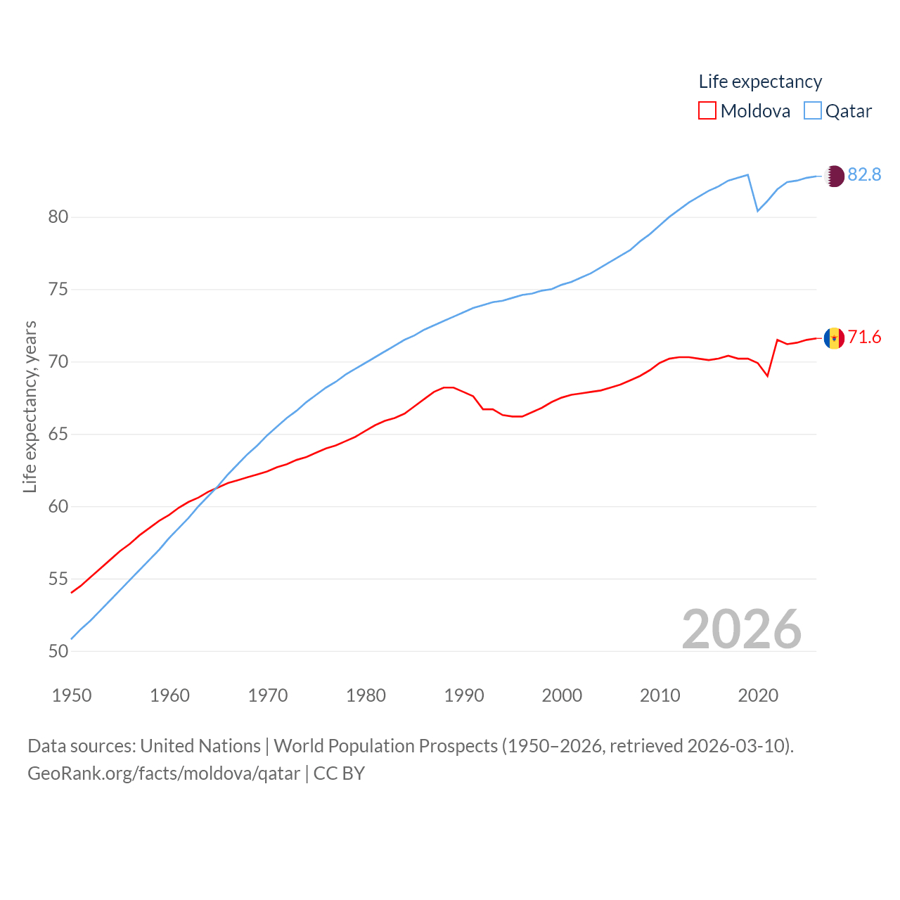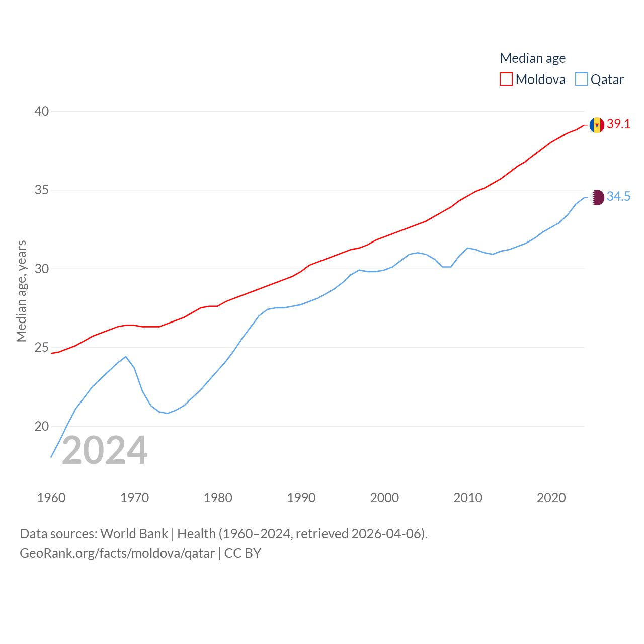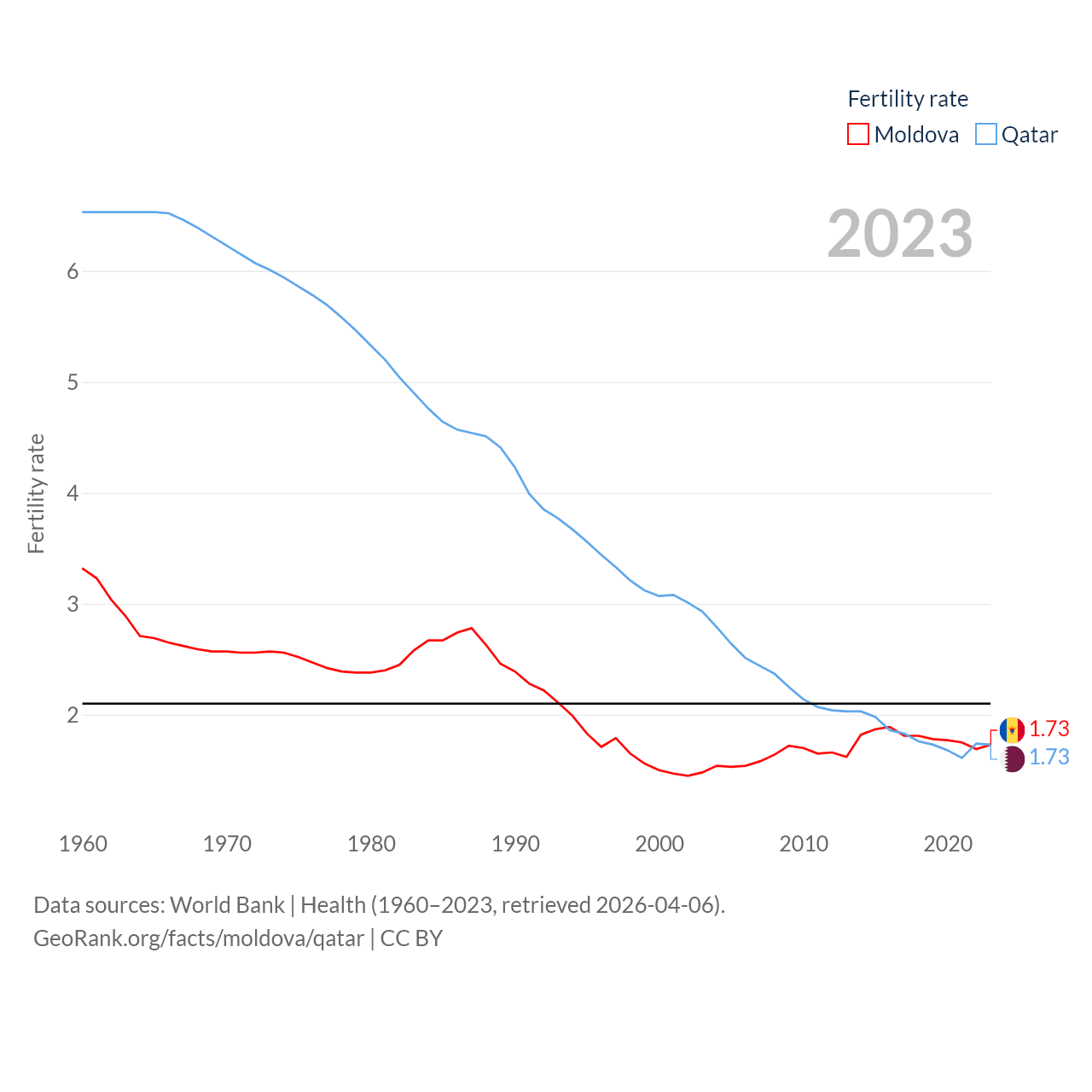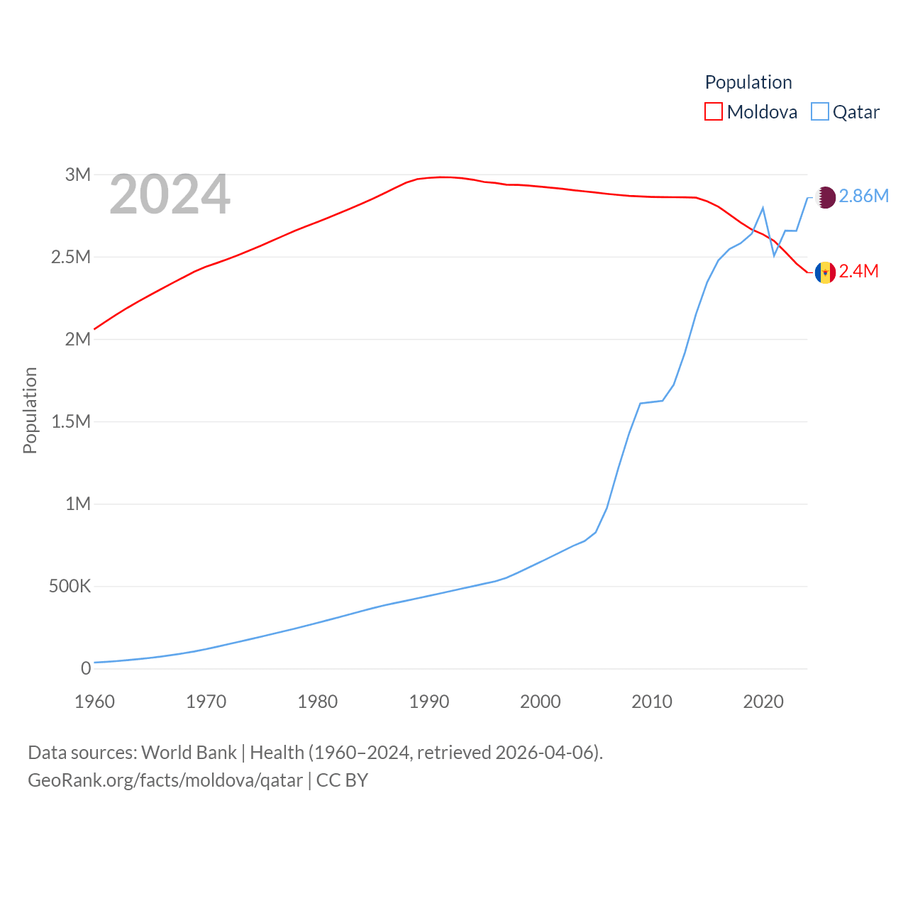 Moldova has a population of 2.4M (ranked 143/197), compared with 2.86M in Qatar (ranked 138/197). Moldova's land area is 12,714 sq mi versus 4,436 sq mi for Qatar (ranked 135th vs. 158th).