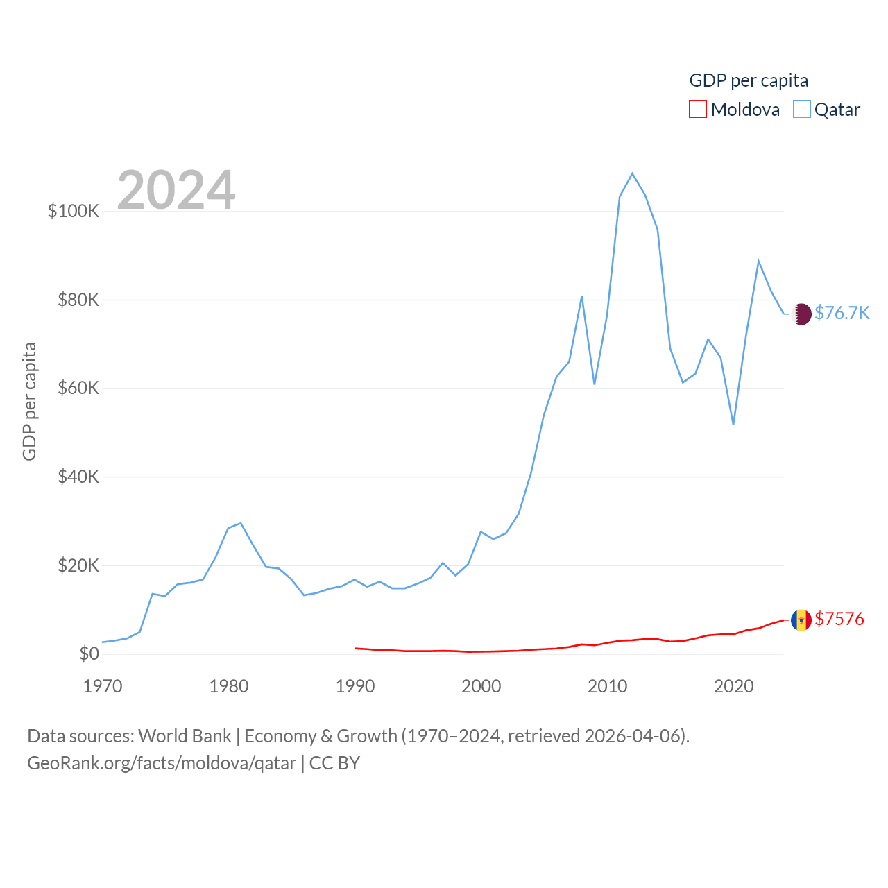 By GDP, Moldova ranks 134/197 ($18.2B) and Qatar ranks 56/197 ($219B). By GDP per capita, Moldova ranks 99/197 ($7,576), while Qatar ranks 11/197 ($76,689).