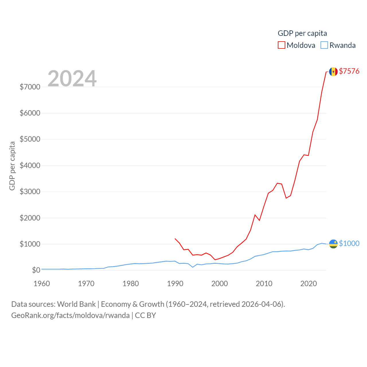 By GDP, Moldova ranks 134/197 ($18.2B) and Rwanda ranks 144/197 ($14.3B). By GDP per capita, Moldova ranks 99/197 ($7,576), while Rwanda ranks 178/197 ($1,000).