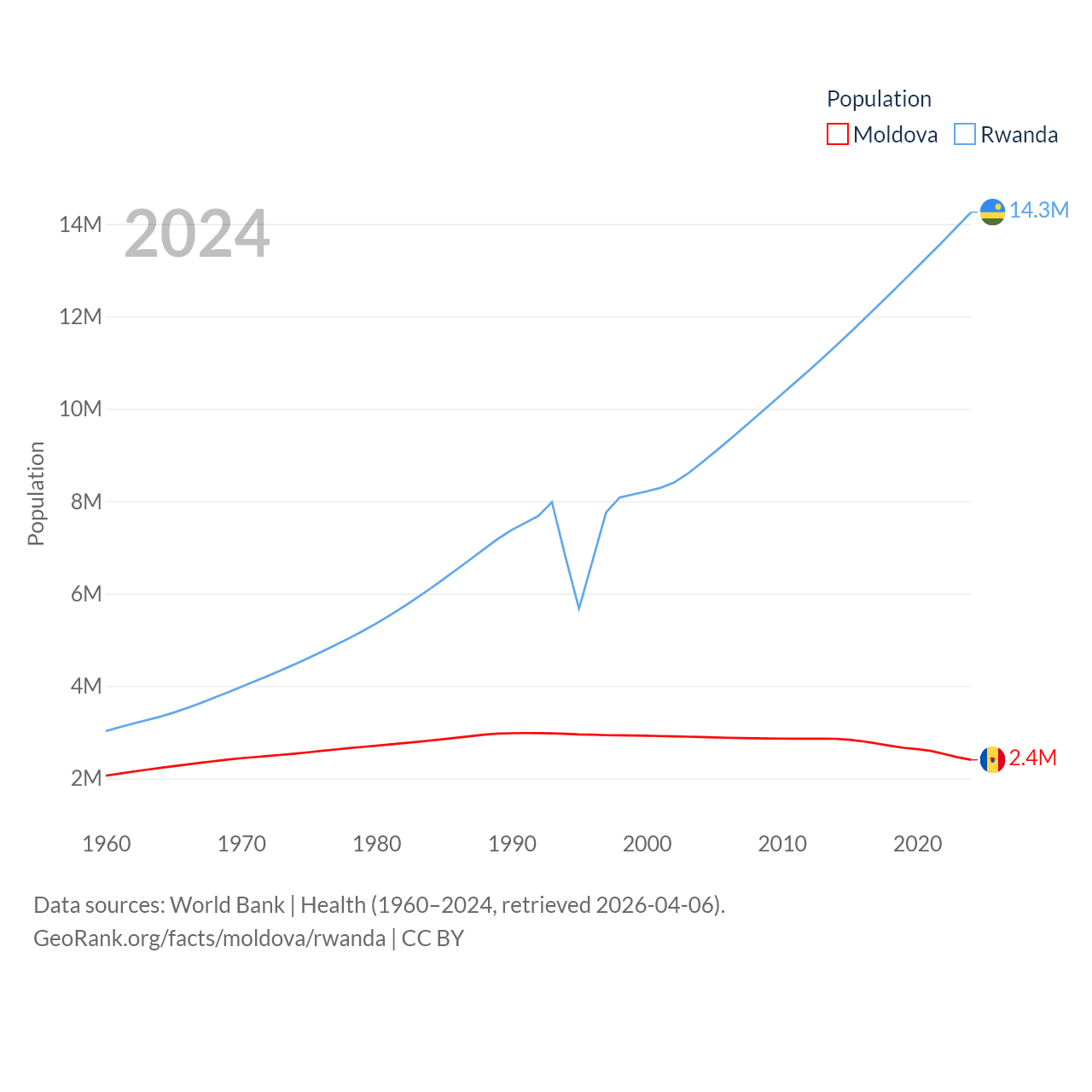 Moldova has a population of 2.4M (ranked 143/197), compared with 14.3M in Rwanda (ranked 77/197). Moldova's land area is 12,714 sq mi versus 9,525 sq mi for Rwanda (ranked 135th vs. 146th).