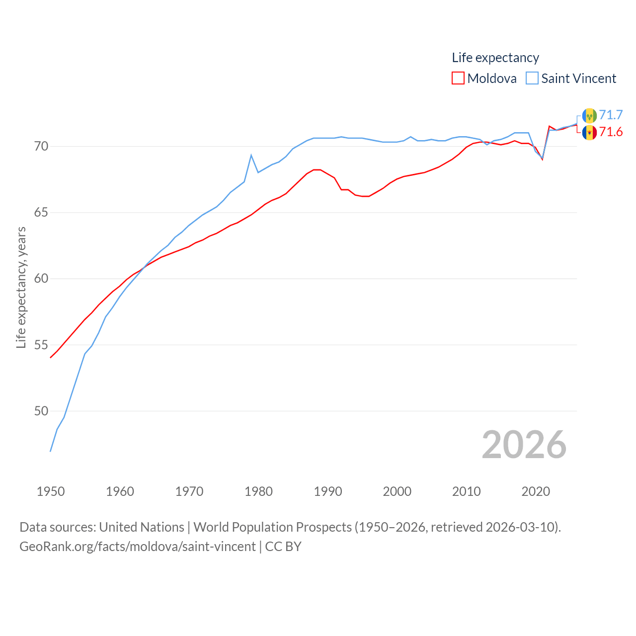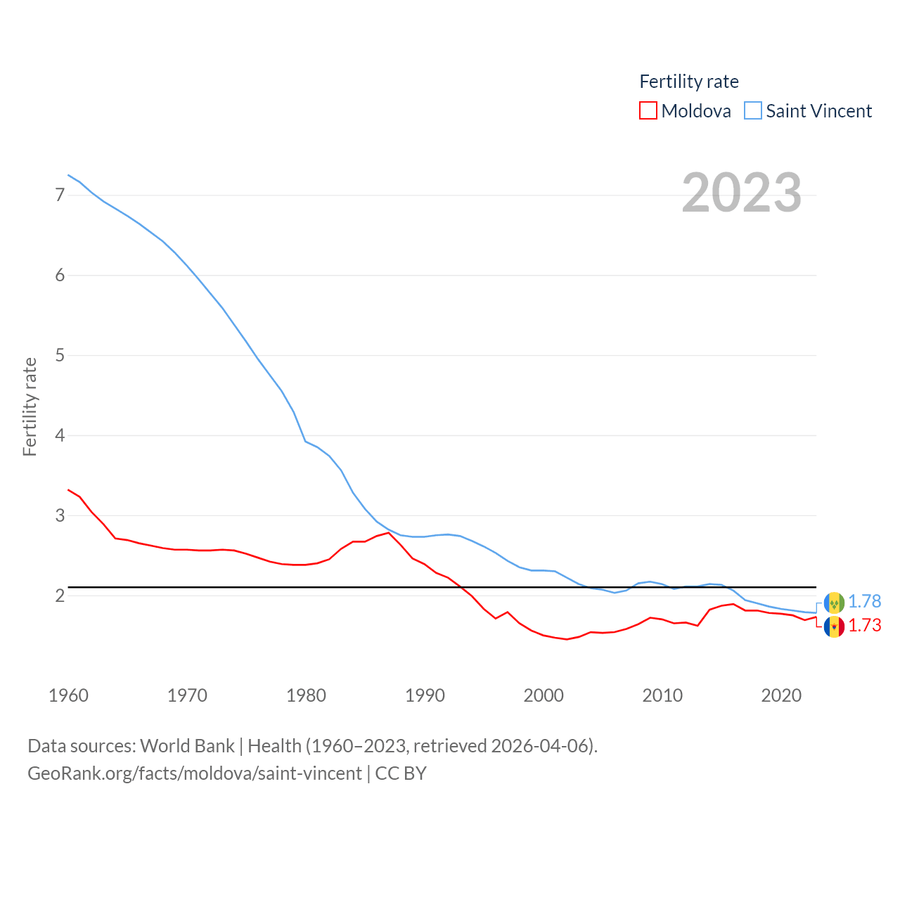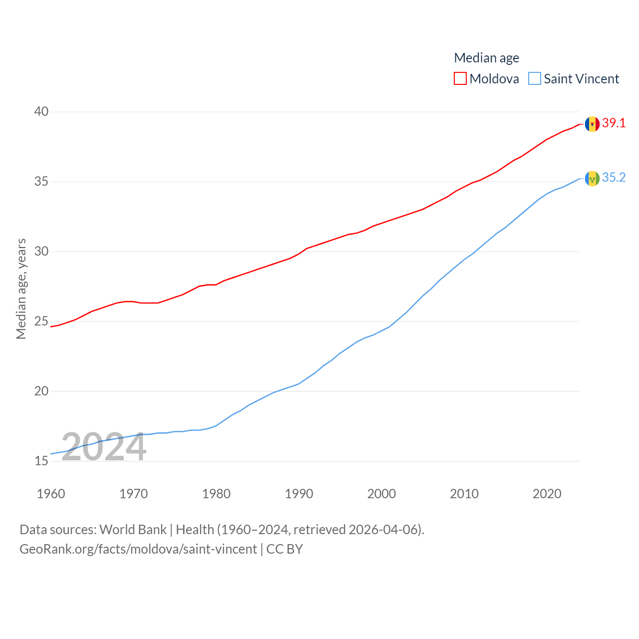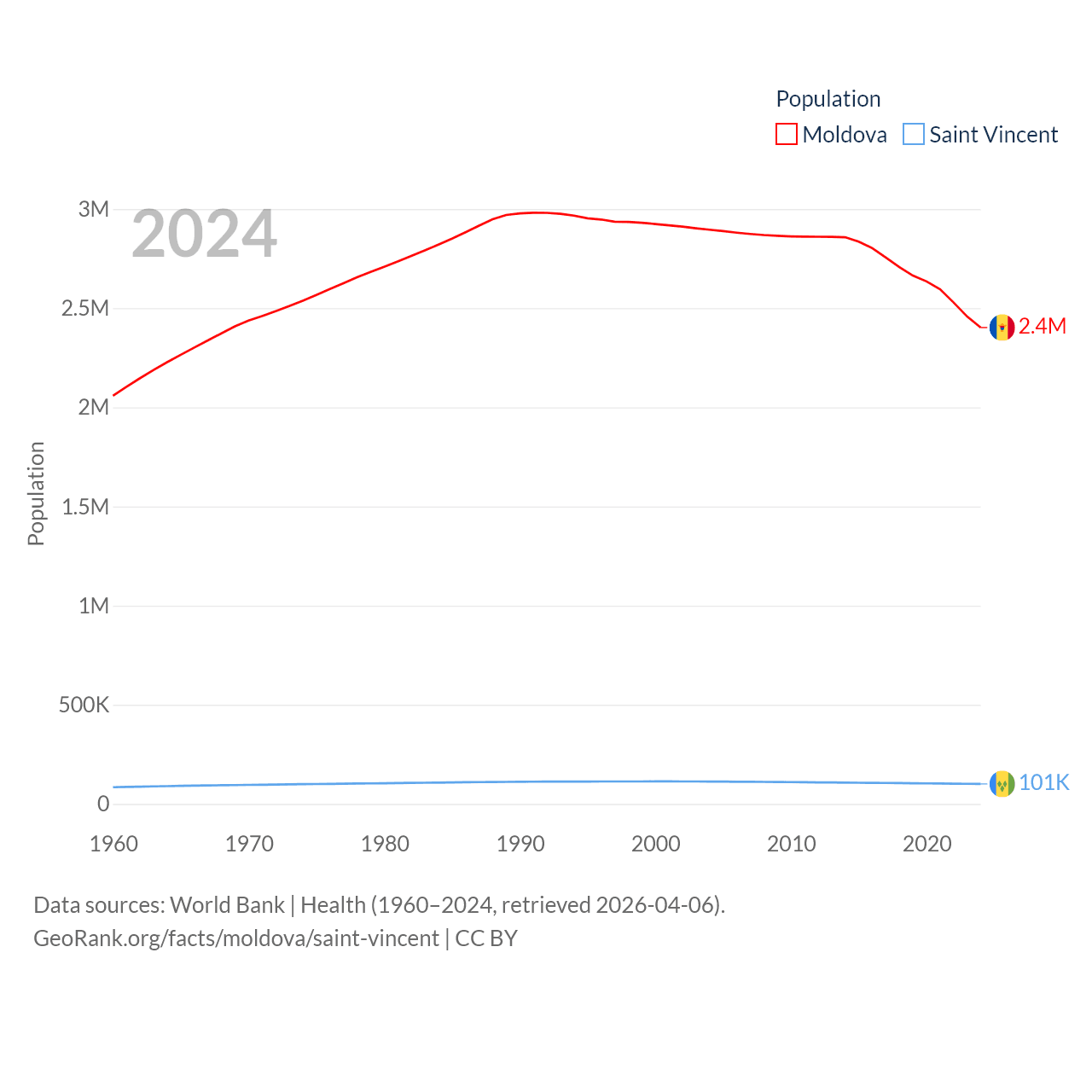 Moldova has a population of 2.4M (ranked 143/197), compared with 101K in Saint Vincent (ranked 184/197). Moldova's land area is 12,714 sq mi versus 150.6 sq mi for Saint Vincent (ranked 135th vs. 185th).