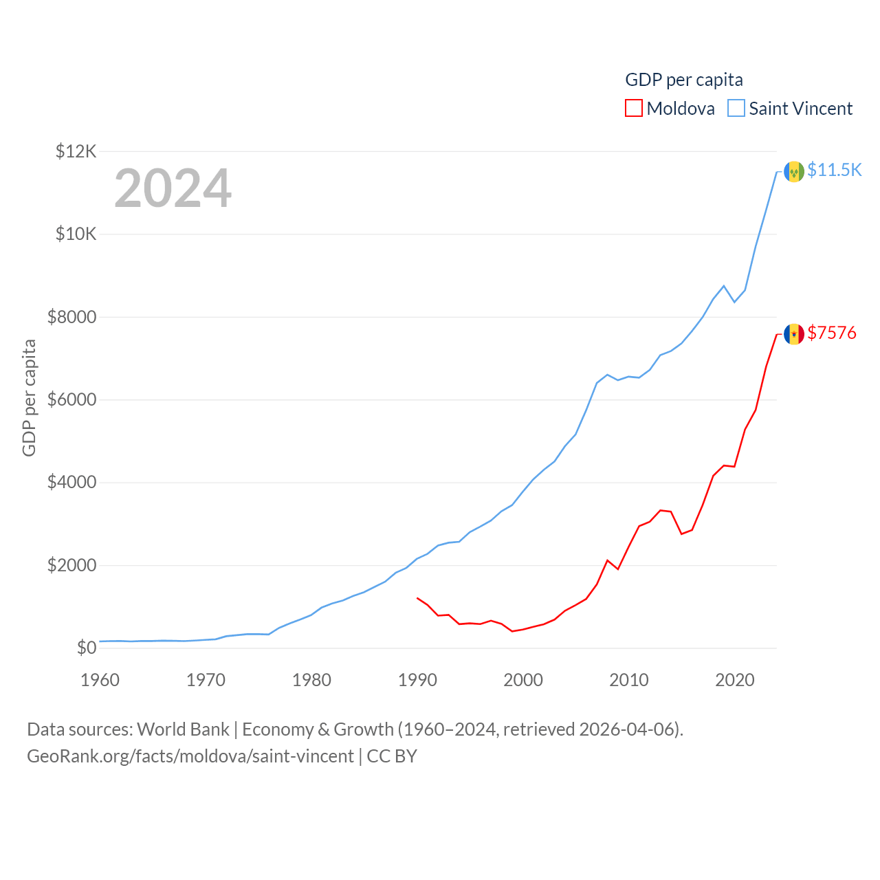 By GDP, Moldova ranks 134/197 ($18.2B) and Saint Vincent ranks 186/197 ($1.16B). By GDP per capita, Moldova ranks 99/197 ($7,576), while Saint Vincent ranks 81/197 ($11,501).