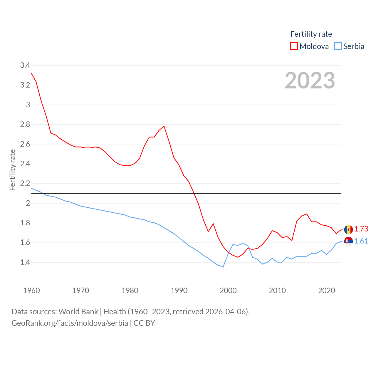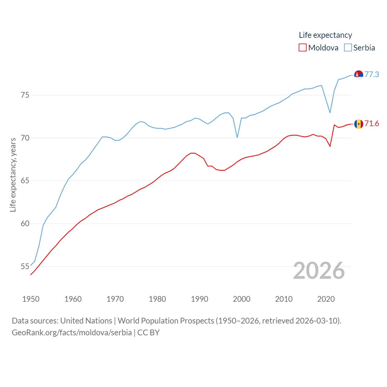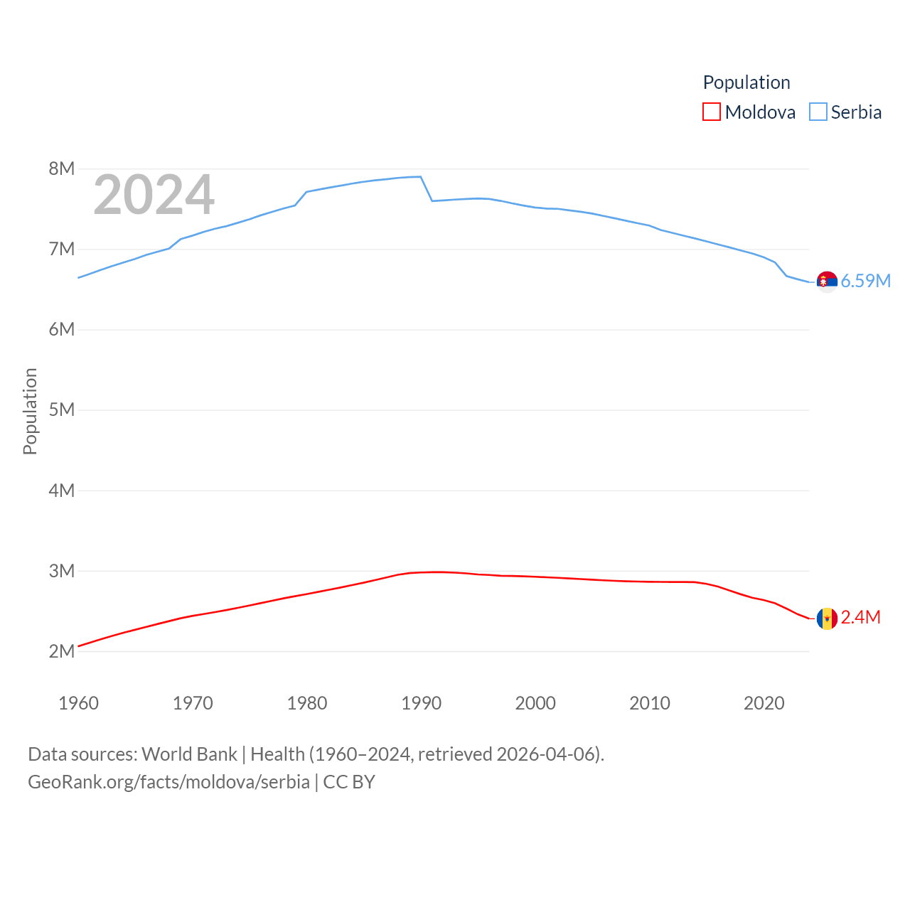 Moldova has a population of 2.4M (ranked 143/197), compared with 6.59M in Serbia (ranked 109/197). Moldova's land area is 12,714 sq mi versus 32,467 sq mi for Serbia (ranked 135th vs. 111th).