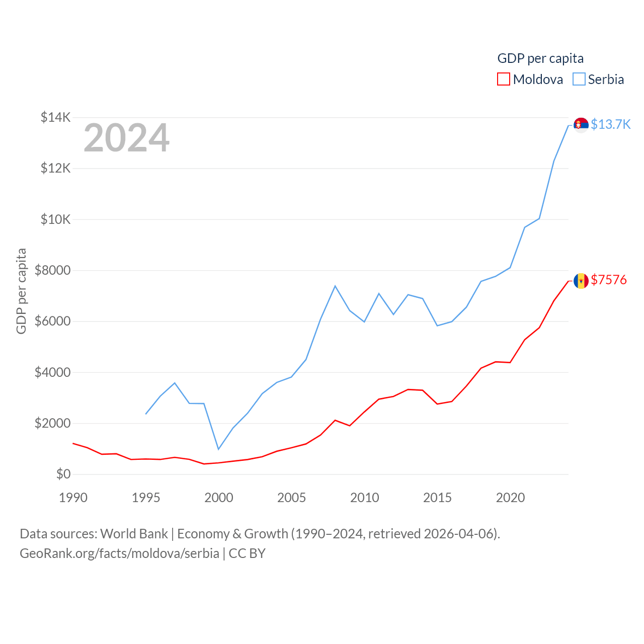 By GDP, Moldova ranks 134/197 ($18.2B) and Serbia ranks 76/197 ($90.1B). By GDP per capita, Moldova ranks 99/197 ($7,576), while Serbia ranks 73/197 ($13,679).