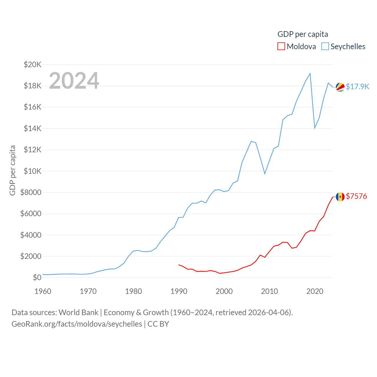 By GDP, Moldova ranks 134/197 ($18.2B) and The Seychelles ranks 178/197 ($2.17B). By GDP per capita, Moldova ranks 99/197 ($7,576), while The Seychelles ranks 63/197 ($17,859).