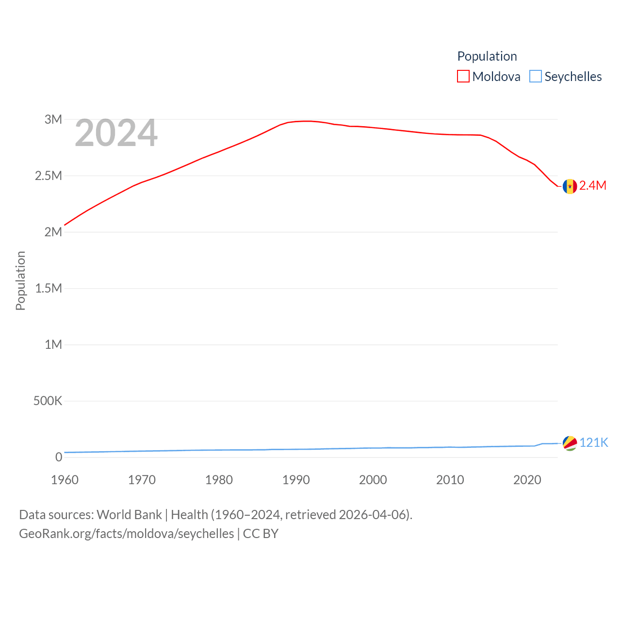 Moldova has a population of 2.4M (ranked 143/197), compared with 121K in The Seychelles (ranked 181/197). Moldova's land area is 12,714 sq mi versus 177.6 sq mi for The Seychelles (ranked 135th vs. 181st).