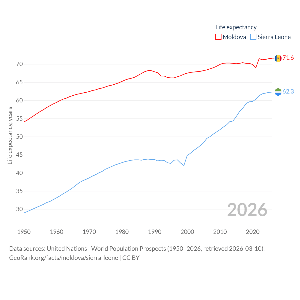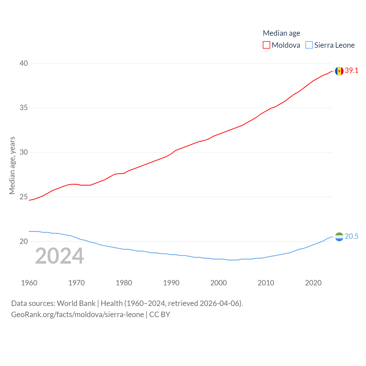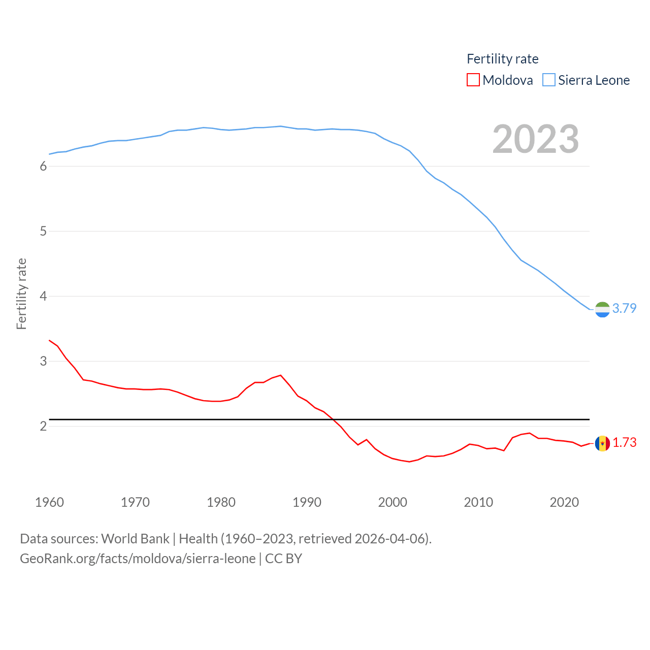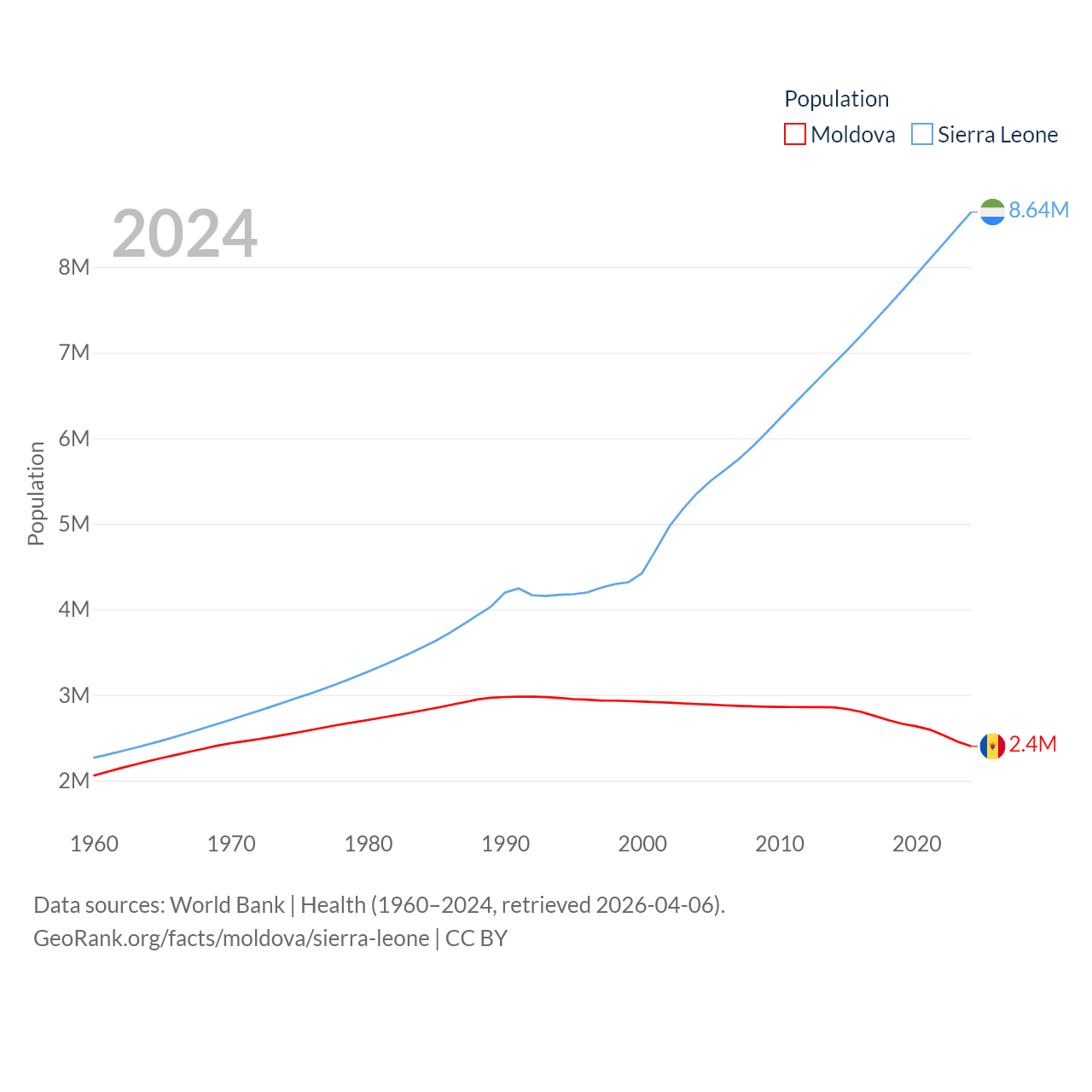 Moldova has a population of 2.4M (ranked 143/197), compared with 8.64M in Sierra Leone (ranked 102/197). Moldova's land area is 12,714 sq mi versus 27,869 sq mi for Sierra Leone (ranked 135th vs. 116th).