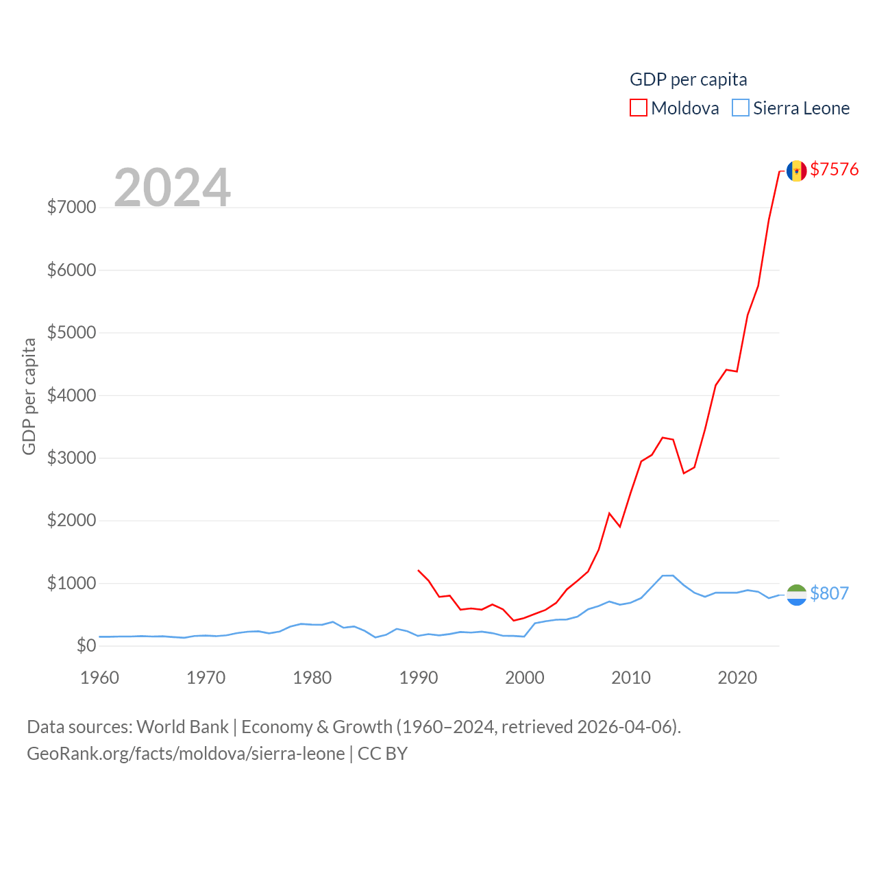 By GDP, Moldova ranks 134/197 ($18.2B) and Sierra Leone ranks 160/197 ($6.97B). By GDP per capita, Moldova ranks 99/197 ($7,576), while Sierra Leone ranks 186/197 ($807).
