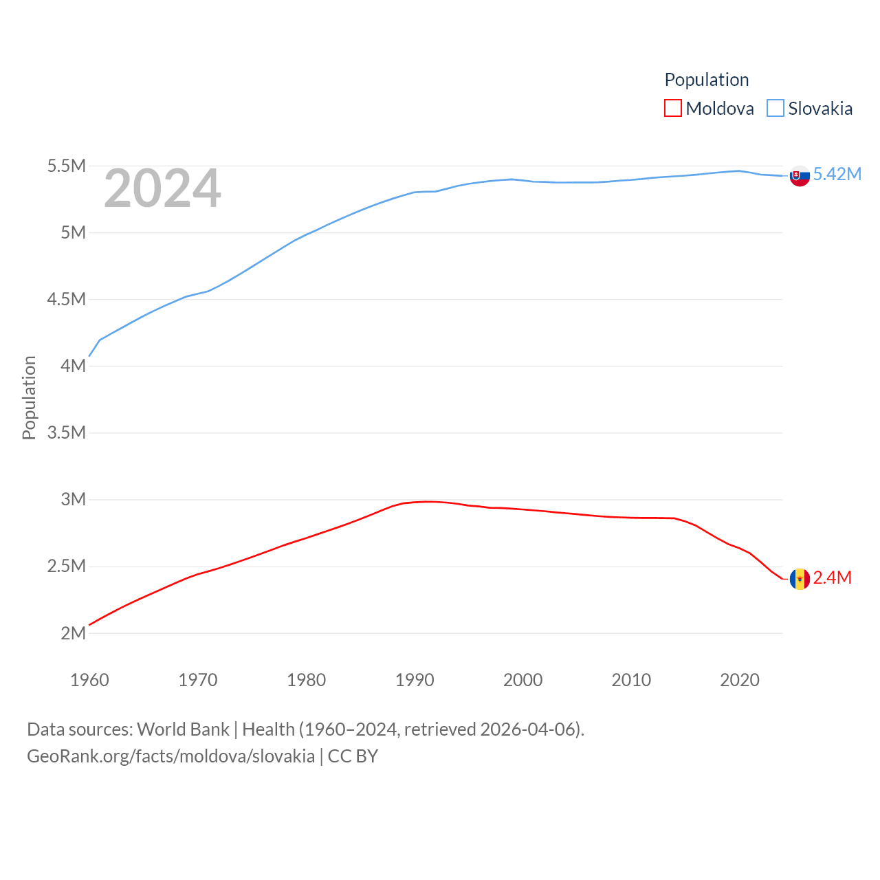 Moldova has a population of 2.4M (ranked 143/197), compared with 5.42M in Slovakia (ranked 119/197). Moldova's land area is 12,714 sq mi versus 18,564 sq mi for Slovakia (ranked 135th vs. 128th).