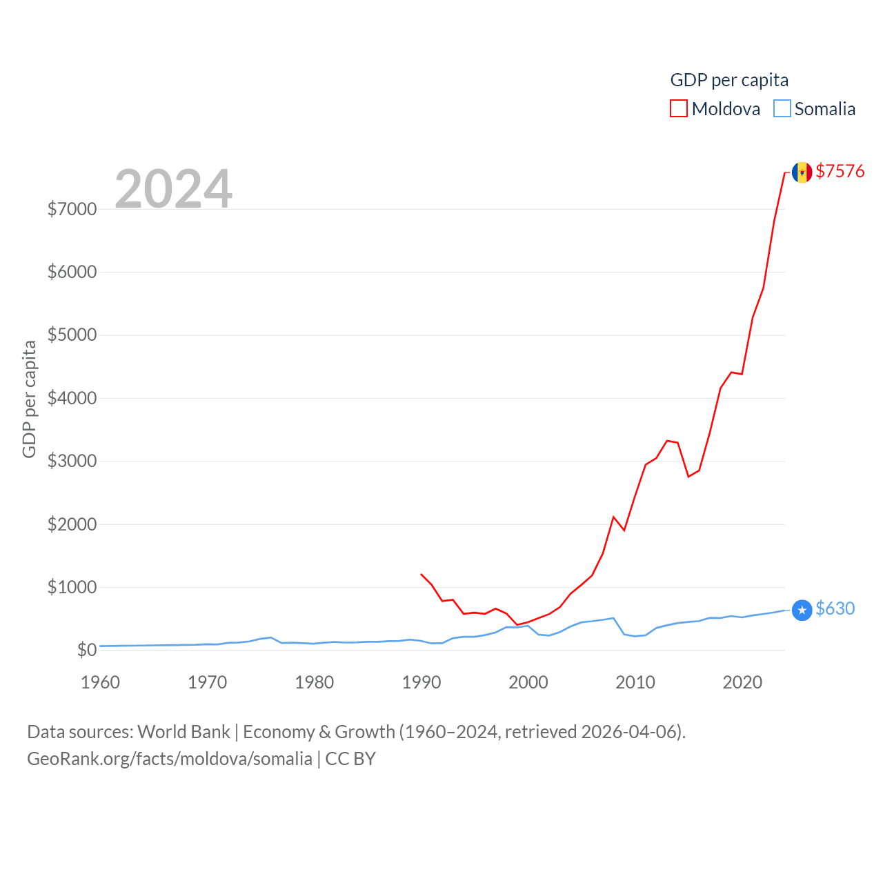 By GDP, Moldova ranks 134/197 ($18.2B) and Somalia ranks 150/197 ($12B). By GDP per capita, Moldova ranks 99/197 ($7,576), while Somalia ranks 192/197 ($630).