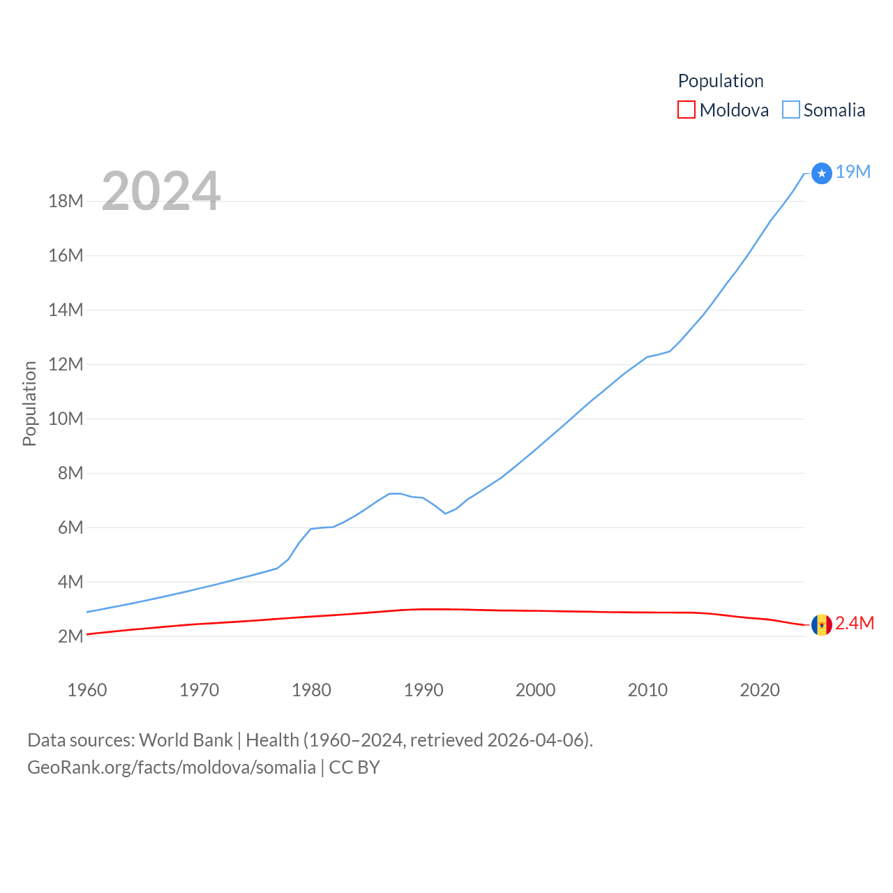 Moldova has a population of 2.4M (ranked 143/197), compared with 19M in Somalia (ranked 68/197). Moldova's land area is 12,714 sq mi versus 242,217 sq mi for Somalia (ranked 135th vs. 42nd).