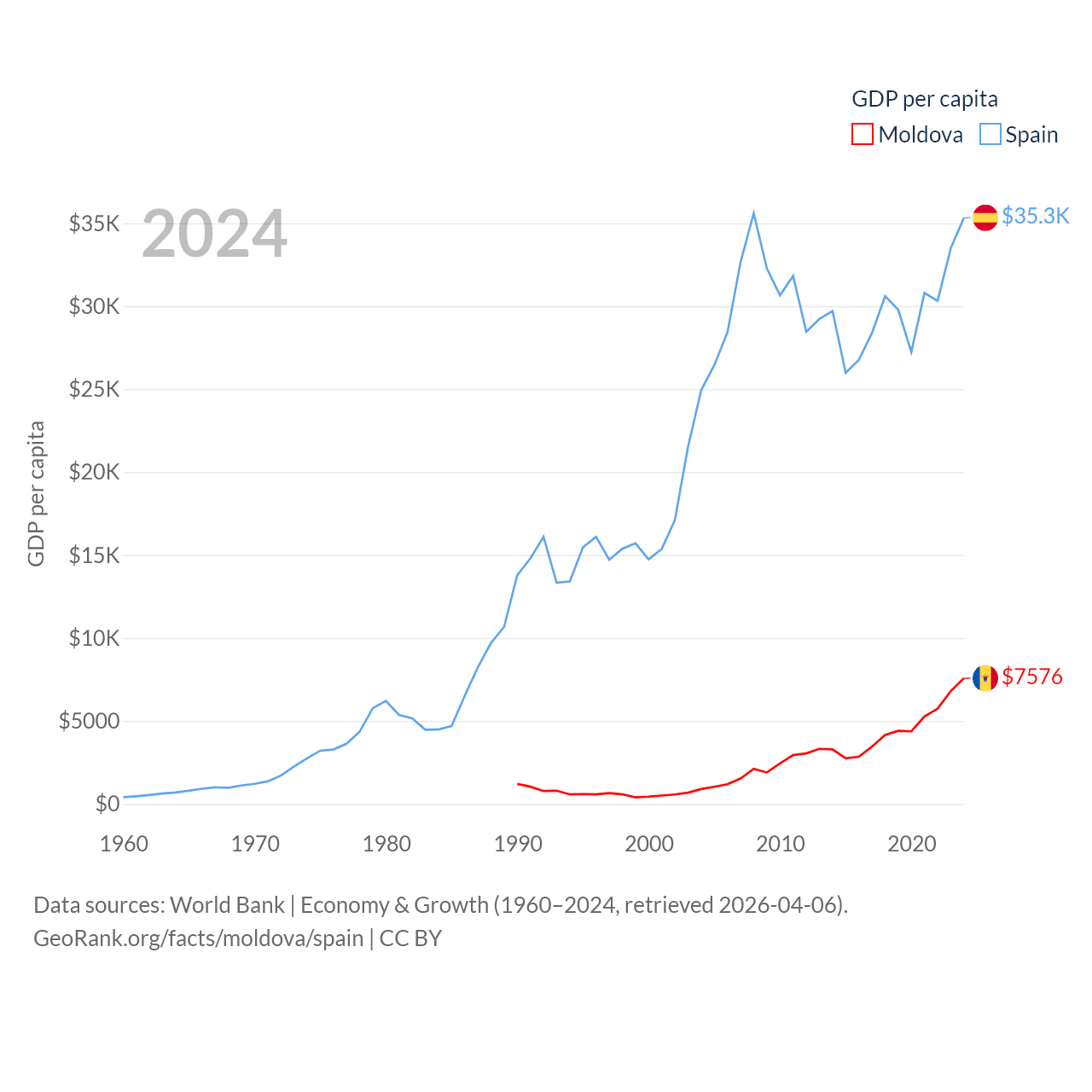 By GDP, Moldova ranks 134/197 ($18.2B) and Spain ranks 15/197 ($1.73T). By GDP per capita, Moldova ranks 99/197 ($7,576), while Spain ranks 32/197 ($35,327).