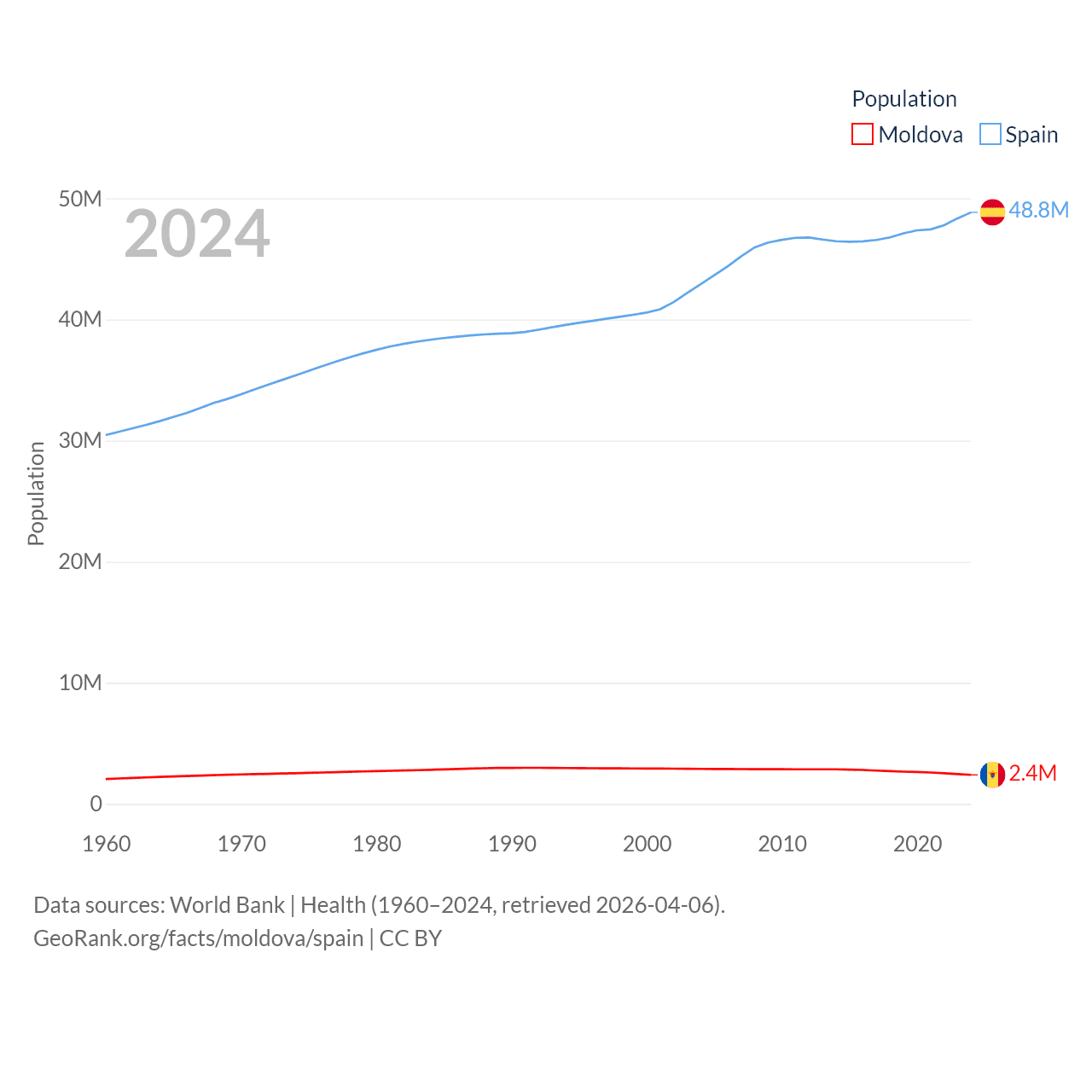 Moldova has a population of 2.4M (ranked 143/197), compared with 48.8M in Spain (ranked 32/197). Moldova's land area is 12,714 sq mi versus 192,934 sq mi for Spain (ranked 135th vs. 51st).