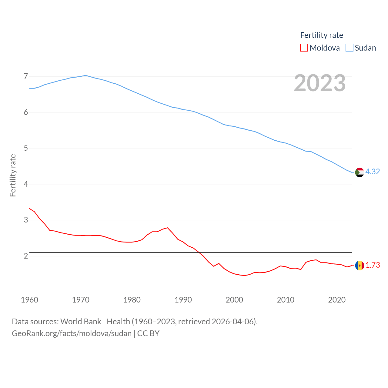 Moldova has a population of 2.4M (ranked 143/197), compared with 50.4M in Sudan (ranked 30/197). Moldova's land area is 12,714 sq mi versus 721,239 sq mi for Sudan (ranked 135th vs. 15th).