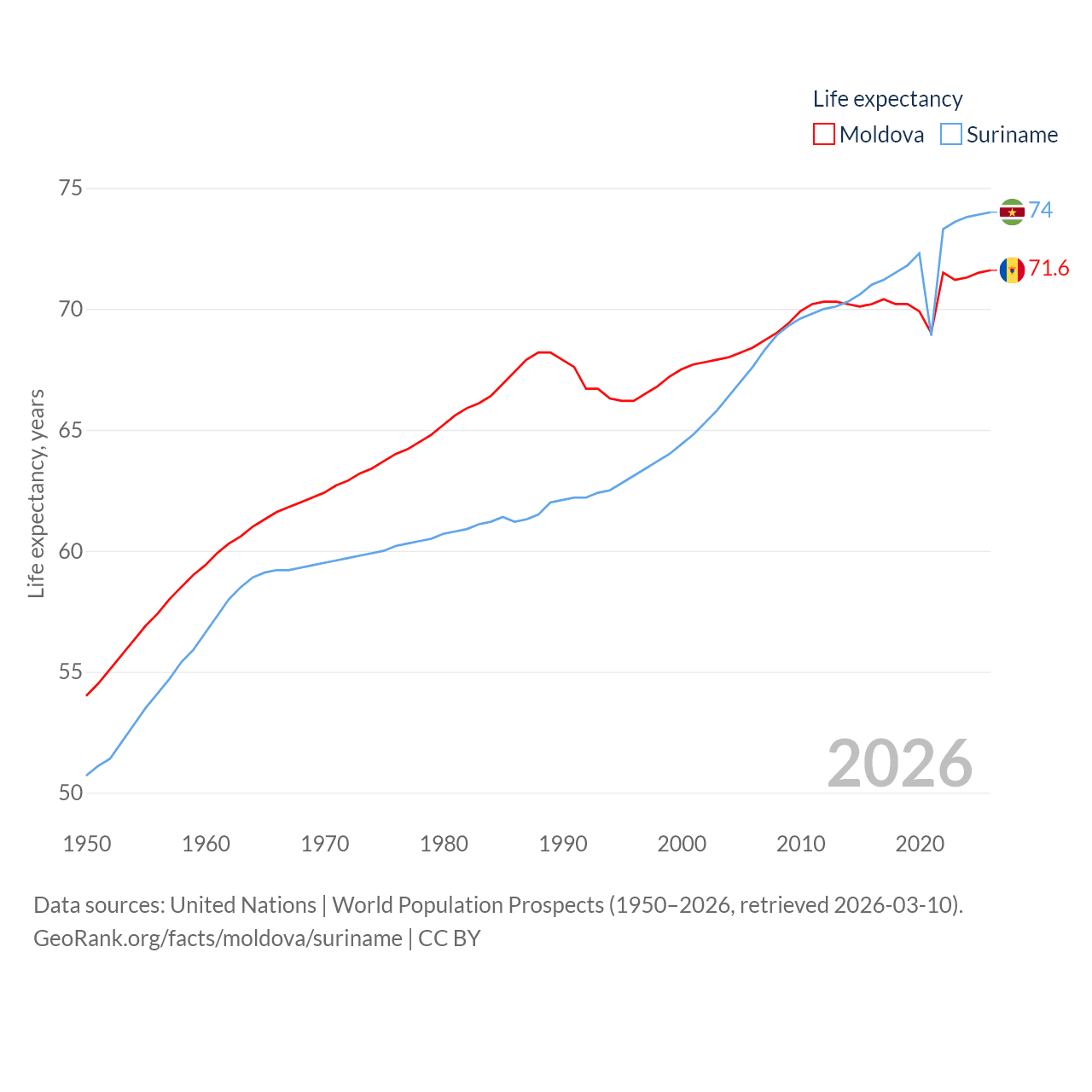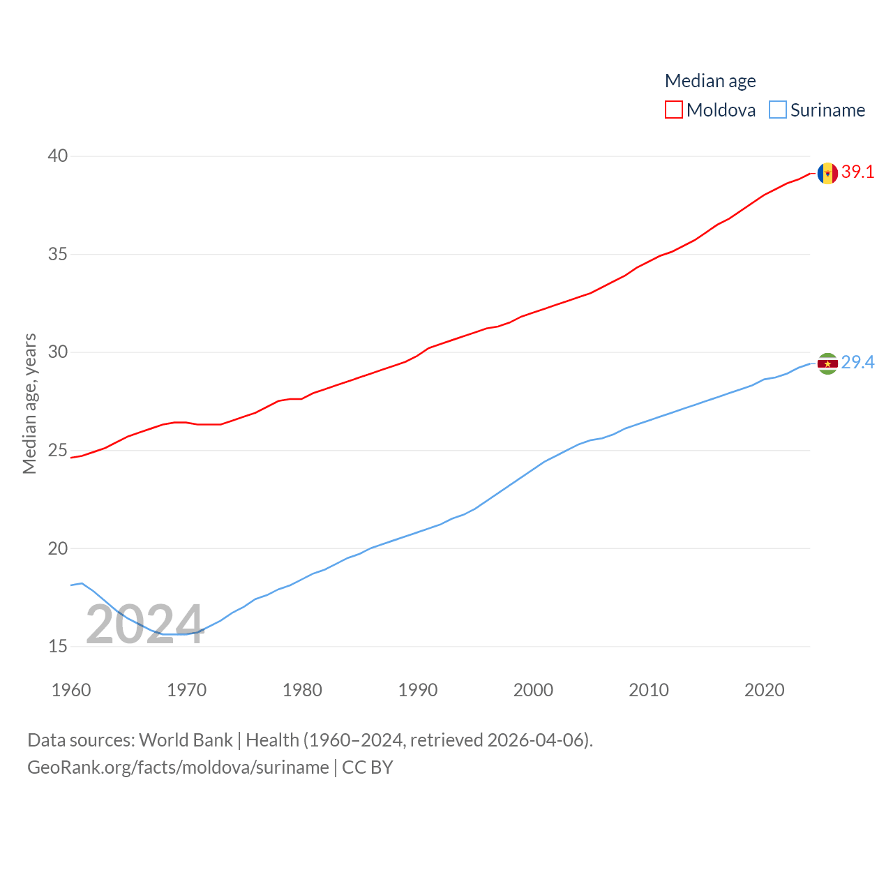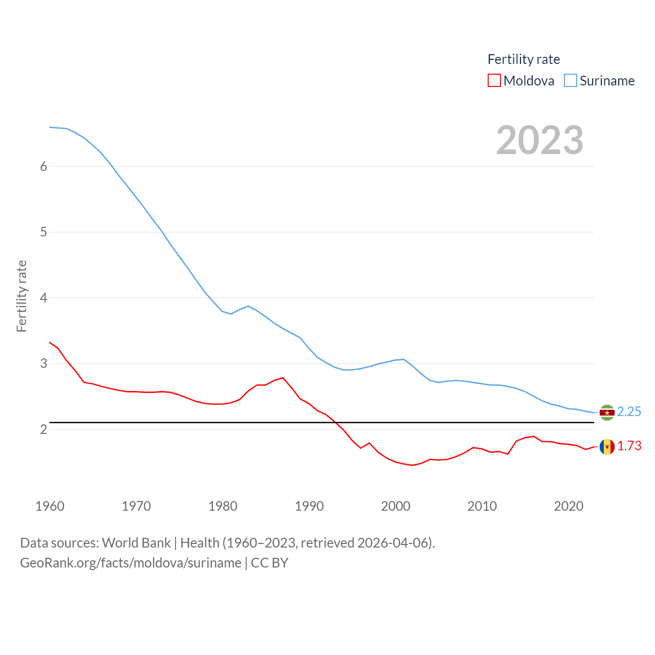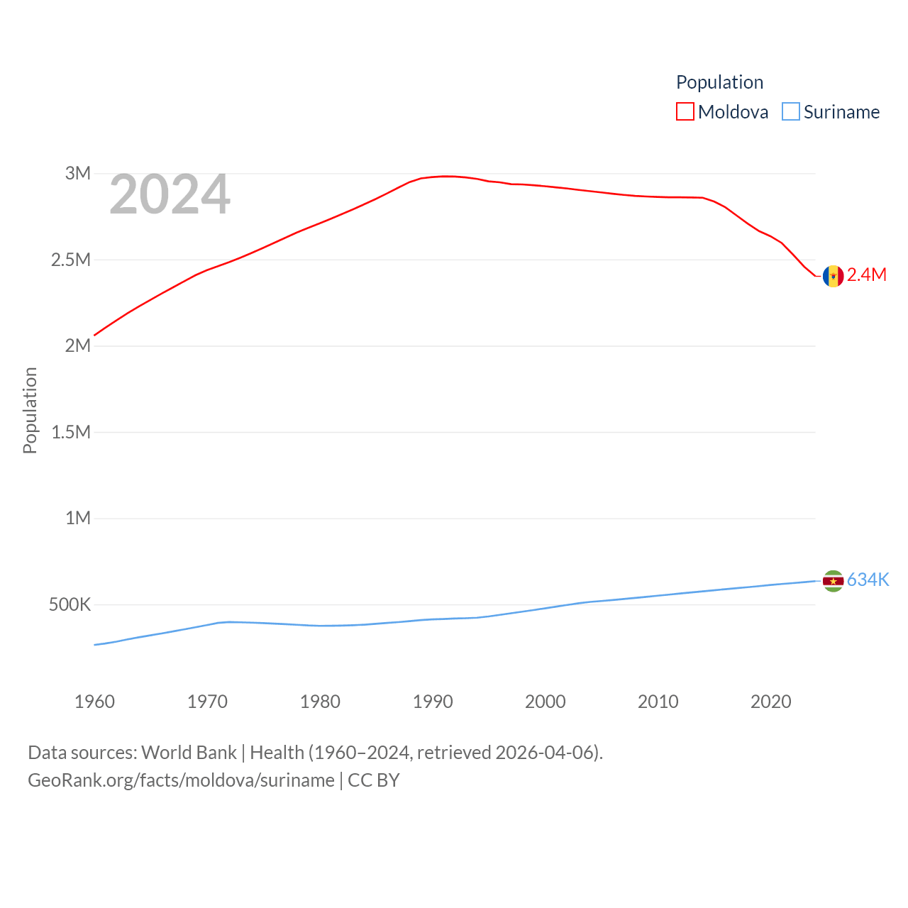 Moldova has a population of 2.4M (ranked 143/197), compared with 634K in Suriname (ranked 165/197). Moldova's land area is 12,714 sq mi versus 61,972 sq mi for Suriname (ranked 135th vs. 90th).