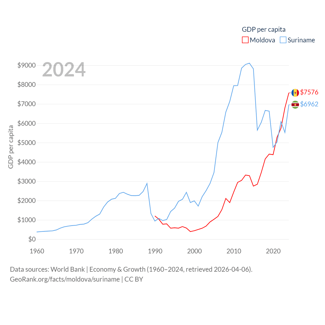 By GDP, Moldova ranks 134/197 ($18.2B) and Suriname ranks 164/197 ($4.42B). By GDP per capita, Moldova ranks 99/197 ($7,576), while Suriname ranks 102/197 ($6,962).