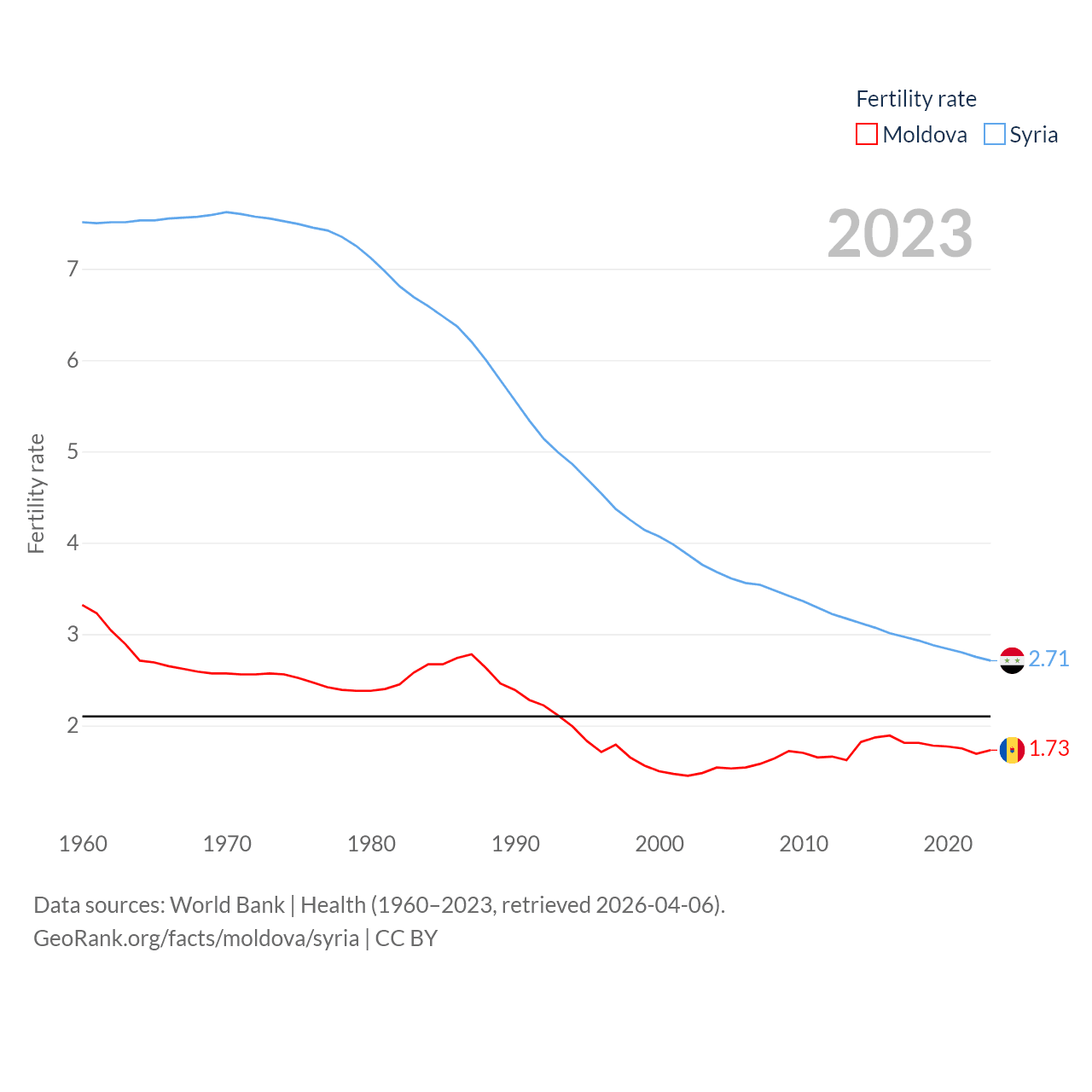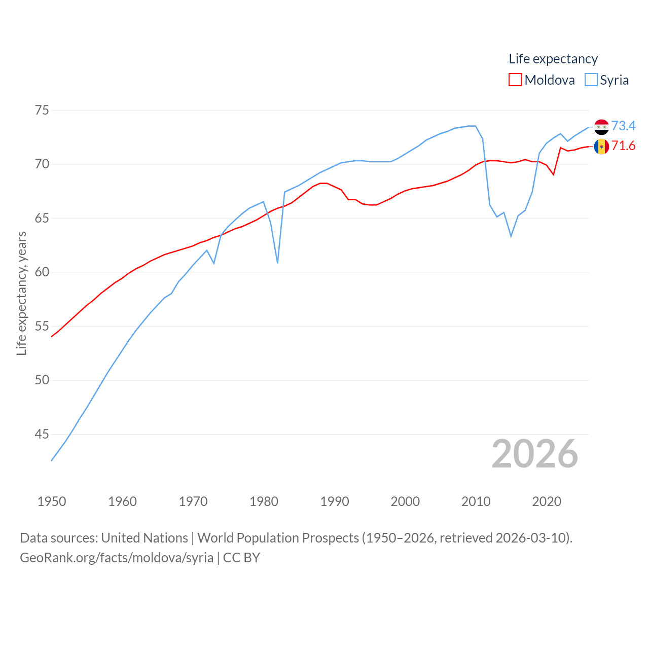 Moldova has a population of 2.4M (ranked 143/197), compared with 24.7M in Syria (ranked 57/197). Moldova's land area is 12,714 sq mi versus 70,900 sq mi for Syria (ranked 135th vs. 87th).