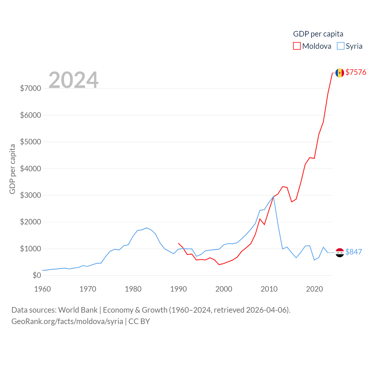 By GDP, Moldova ranks 134/197 ($18.2B) and Syria ranks 129/197 ($20B). By GDP per capita, Moldova ranks 99/197 ($7,576), while Syria ranks 185/197 ($847).