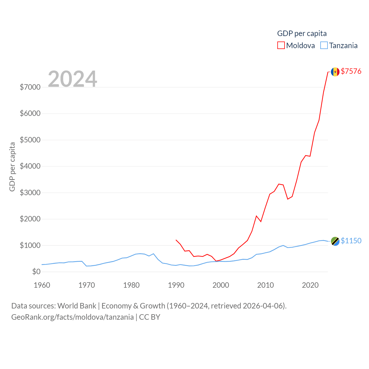 By GDP, Moldova ranks 134/197 ($18.2B) and Tanzania ranks 82/197 ($78.8B). By GDP per capita, Moldova ranks 99/197 ($7,576), while Tanzania ranks 170/197 ($1,150).