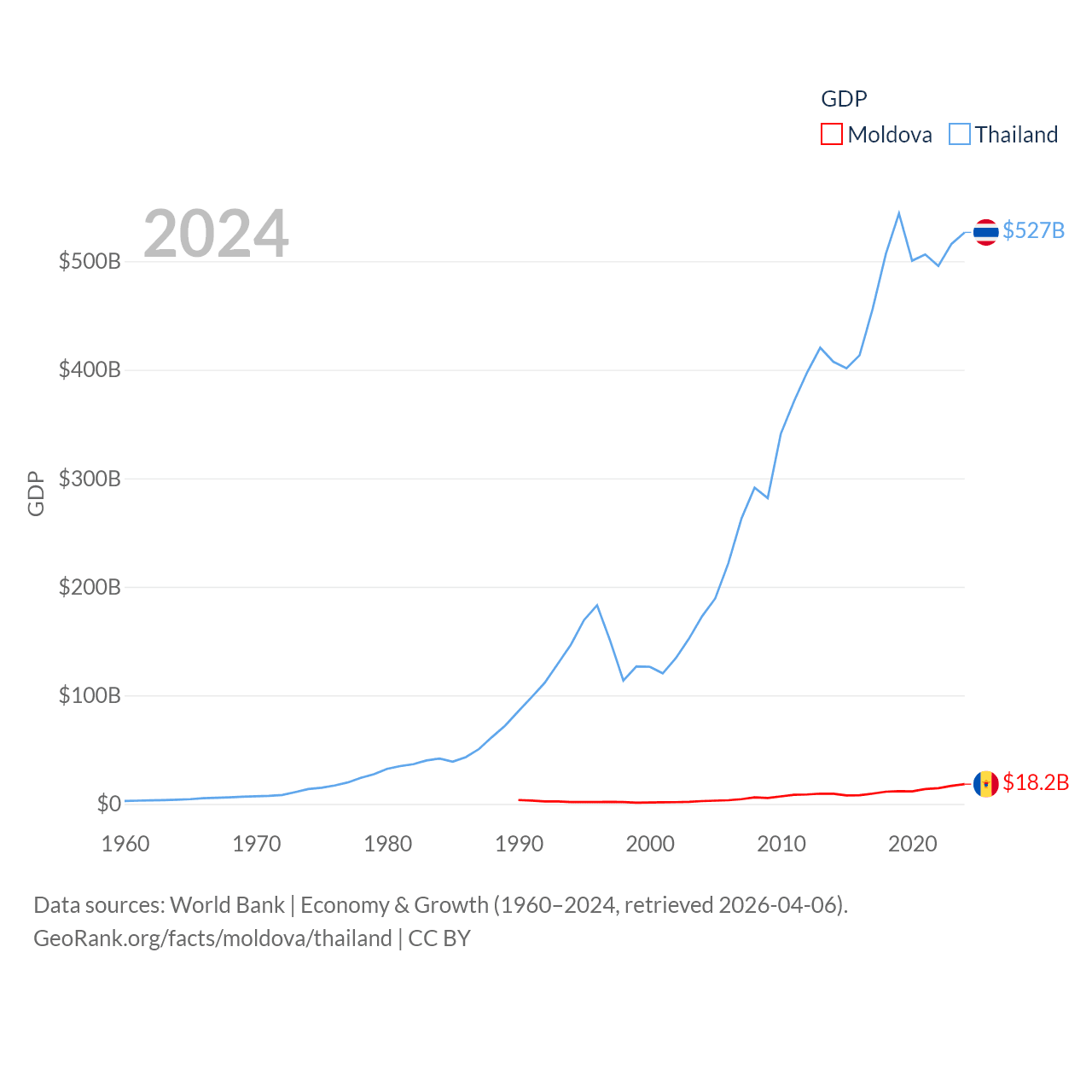 By GDP, Moldova ranks 134/197 ($18.2B) and Thailand ranks 31/197 ($527B). By GDP per capita, Moldova ranks 99/197 ($7,576), while Thailand ranks 100/197 ($7,347).
